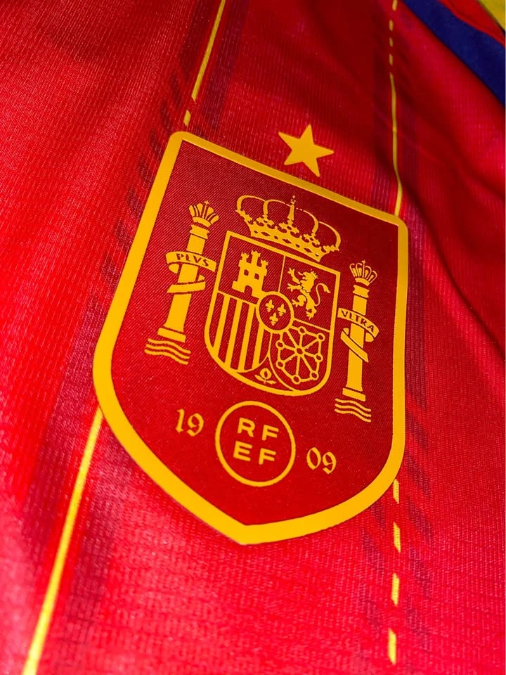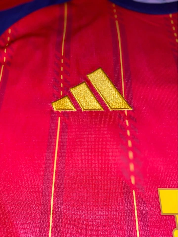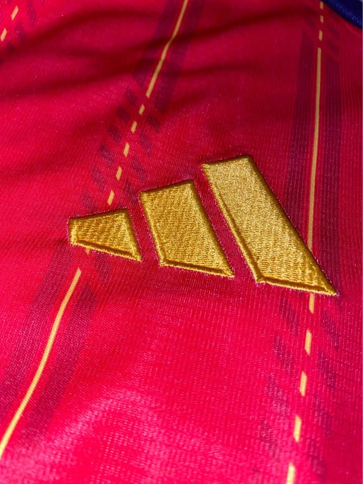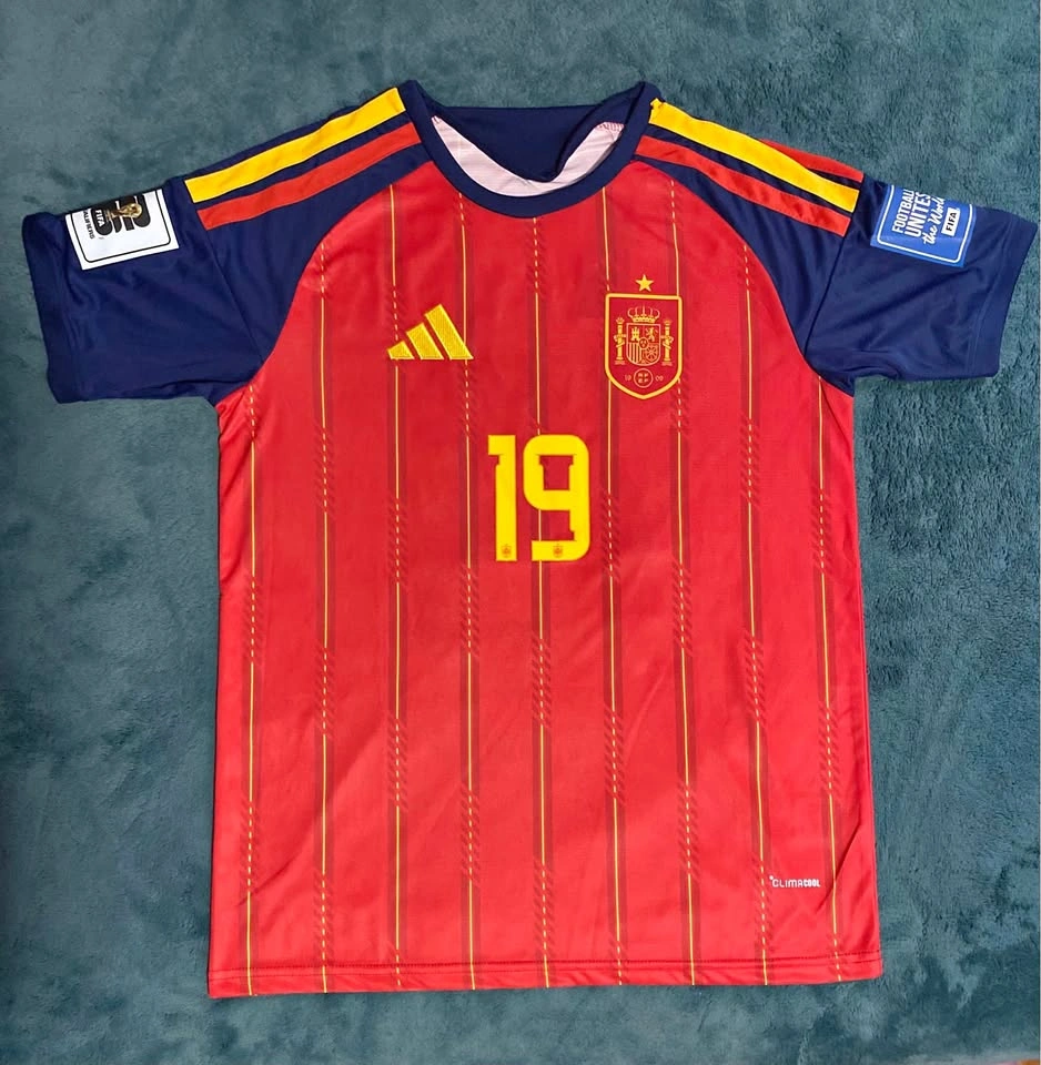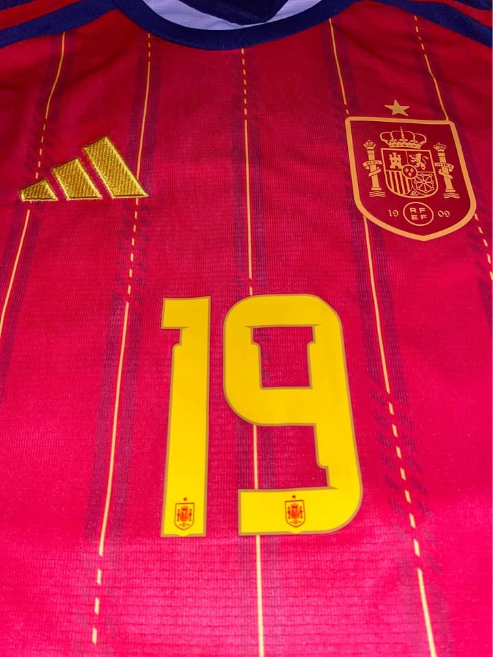 The product is a 2026 World Cup national team jersey for Spain, featuring patches of player Lamine Yamal. Made by adidas, this medium-sized soccer jersey is designed in a multi-color scheme, representing the Spanish national team. A must-have for fans of Spanish soccer, this jersey combines style and support for the team.