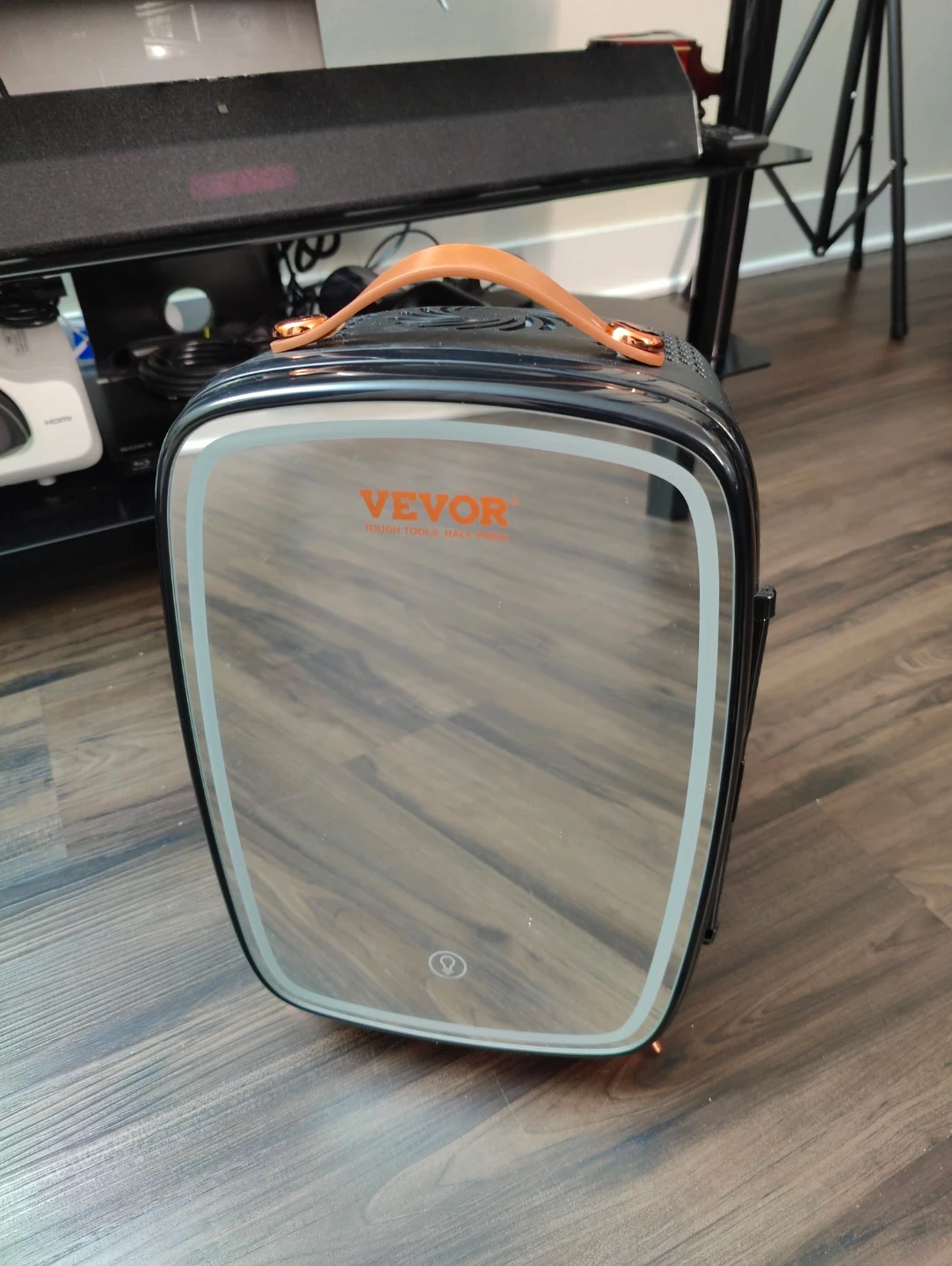 This is a mini refrigerator with a lighted mirror door. It's black with copper accents and includes a removable shelf. Perfect for cosmetics, small drinks, bedroom or desktop and as a portable makeup cooler.