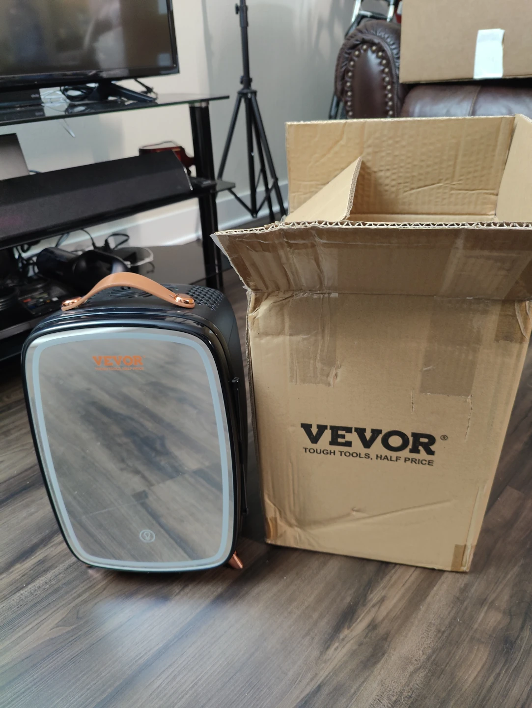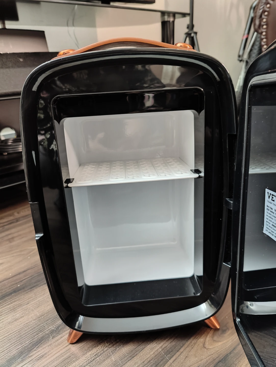 This is a mini refrigerator with a lighted mirror door. It's black with copper accents and includes a removable shelf. Perfect for cosmetics, small drinks, bedroom or desktop and as a portable makeup cooler.