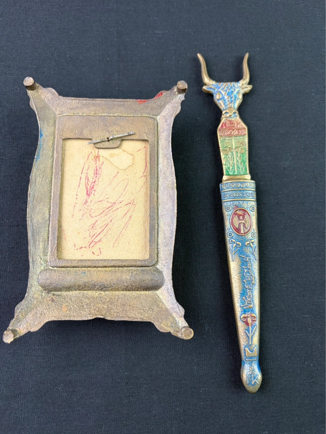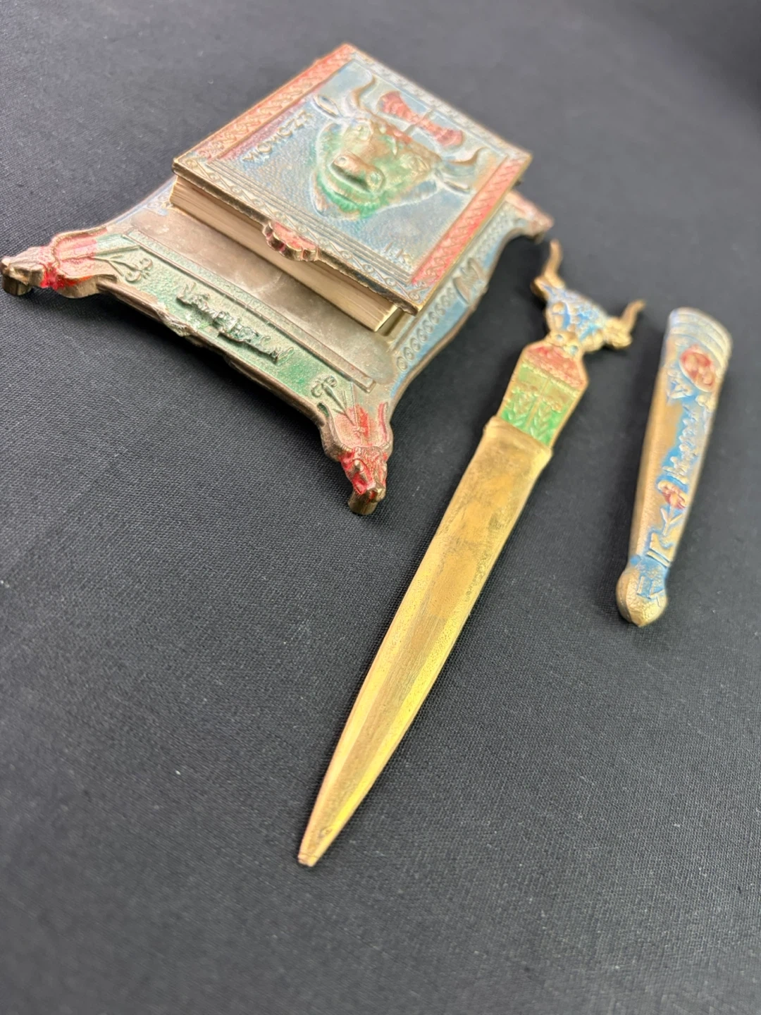 Vintage Knosos Cast Brass Souvenir Notepad holder w/ Bull and Axe Pattern Letter opener. This is a vintage desk set with a decorative letter opener and ornate stand. The stand features intricate detailing and a bull motif. The letter opener has a matching design with a bull's head handle.