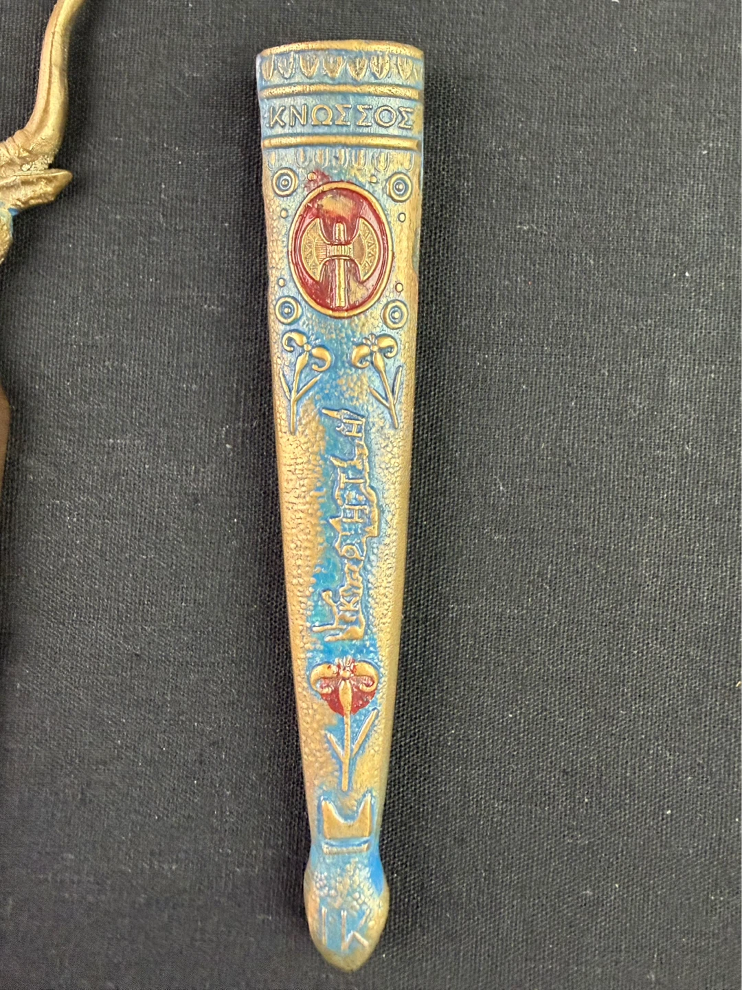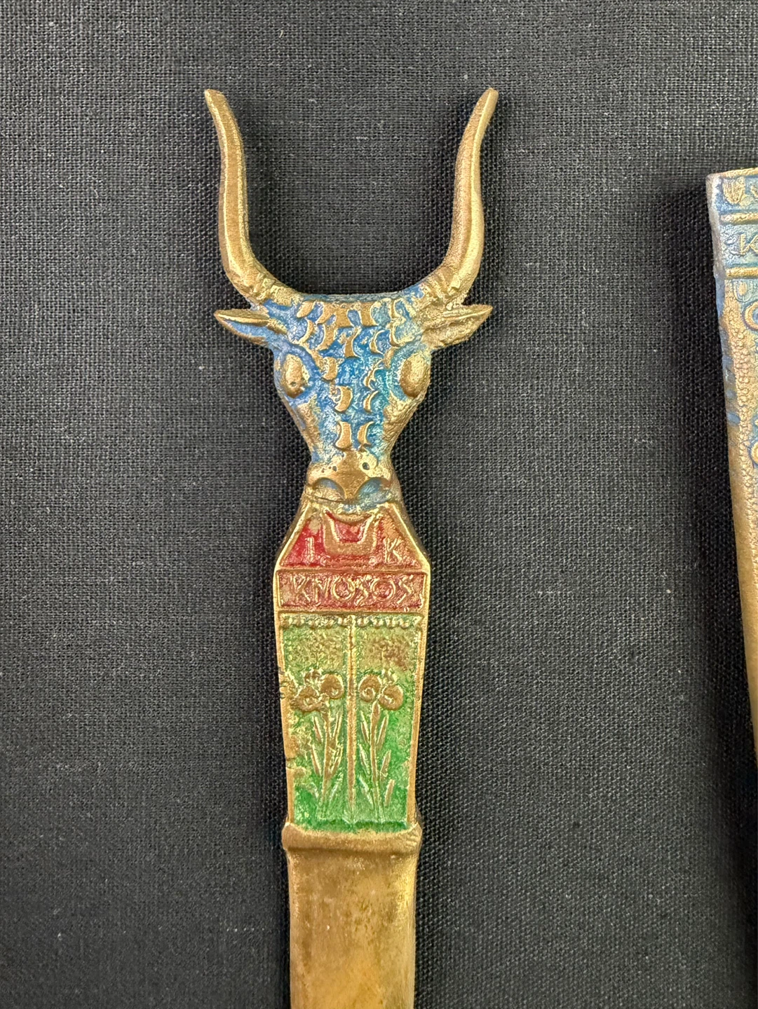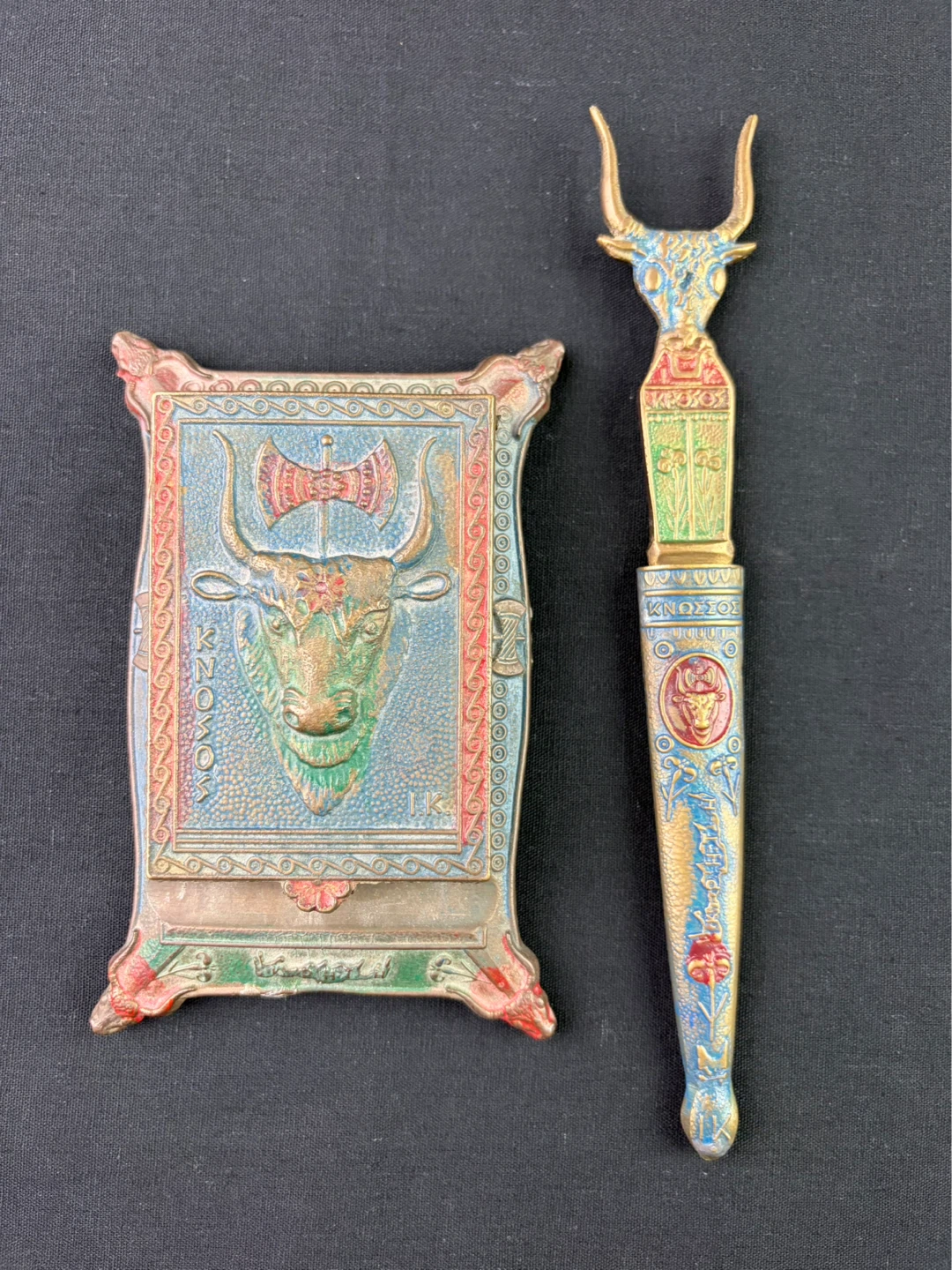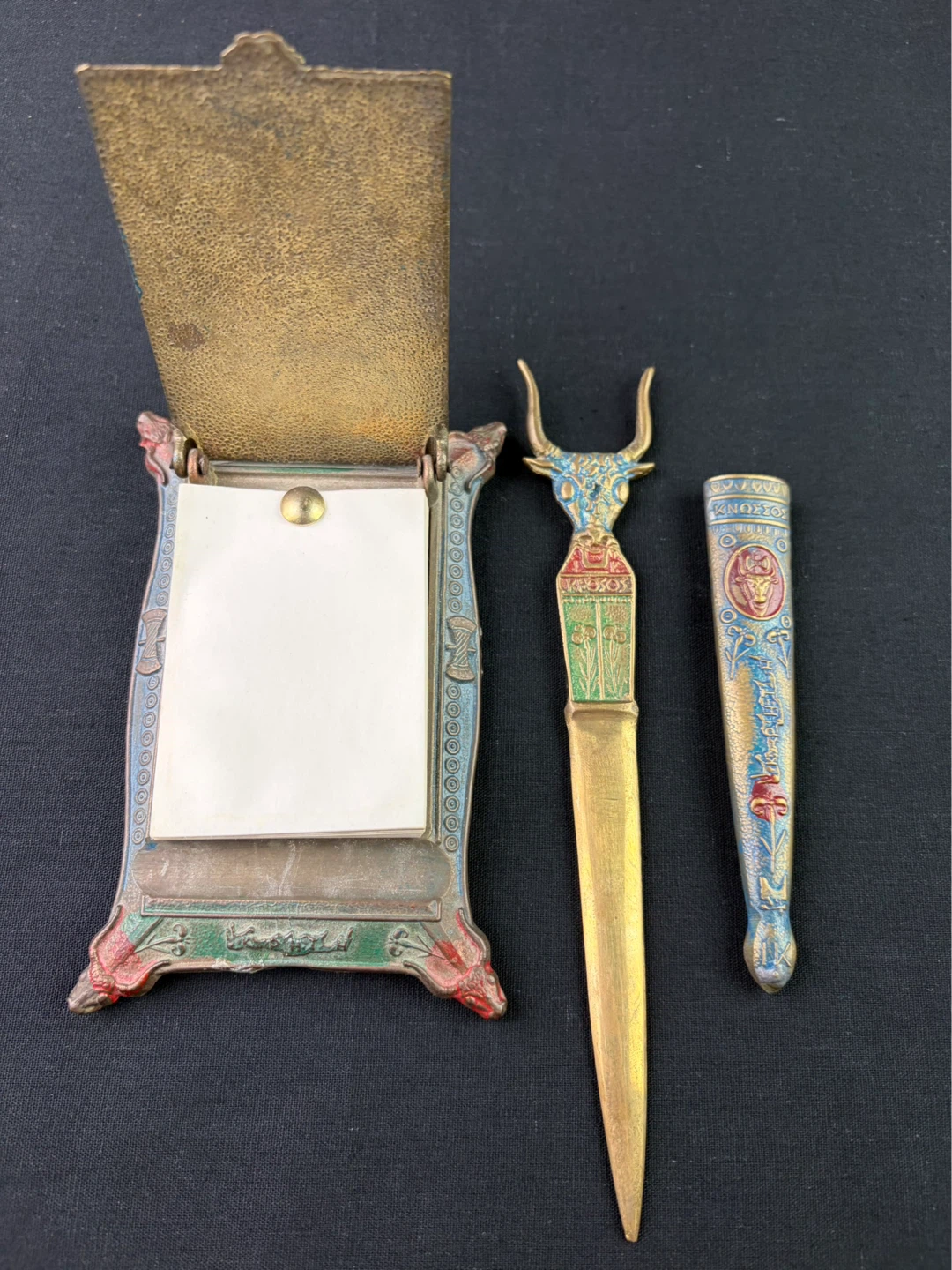 Vintage Knosos Cast Brass Souvenir Notepad holder w/ Bull and Axe Pattern Letter opener. This is a vintage desk set with a decorative letter opener and ornate stand. The stand features intricate detailing and a bull motif. The letter opener has a matching design with a bull's head handle.