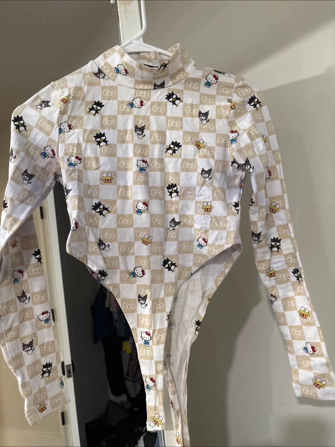 Long sleeve bodysuit. Mock neck. Checkered pattern features Hello Kitty, Kuromi, and other Sanrio characters. Beige and white.