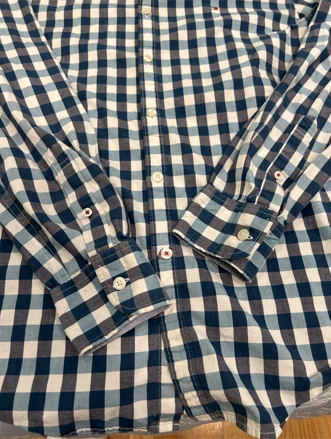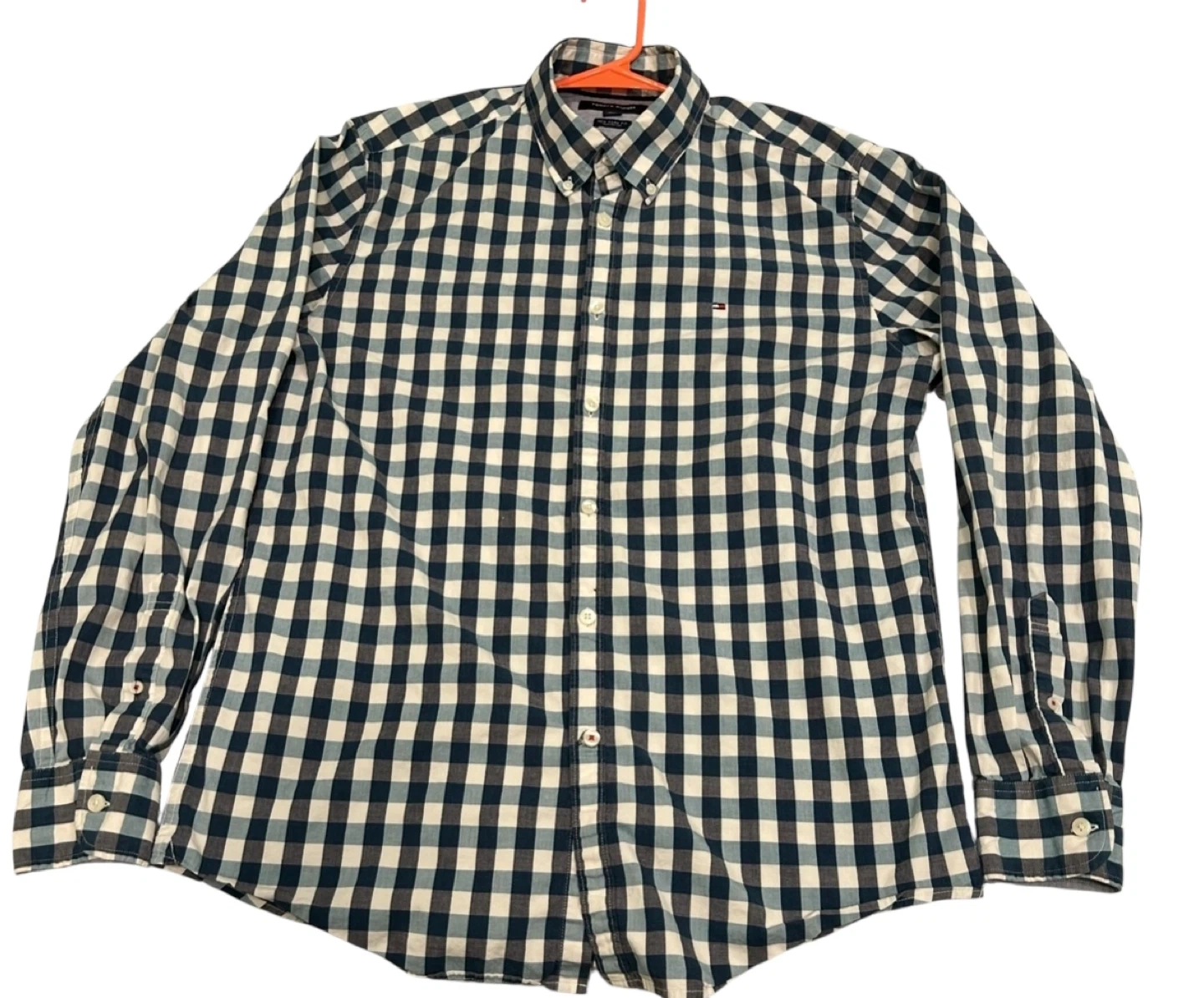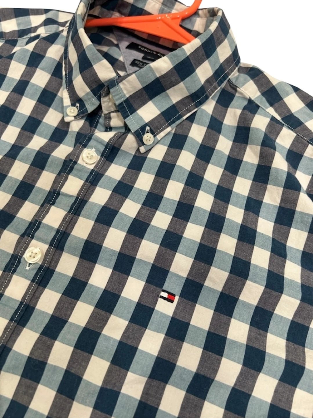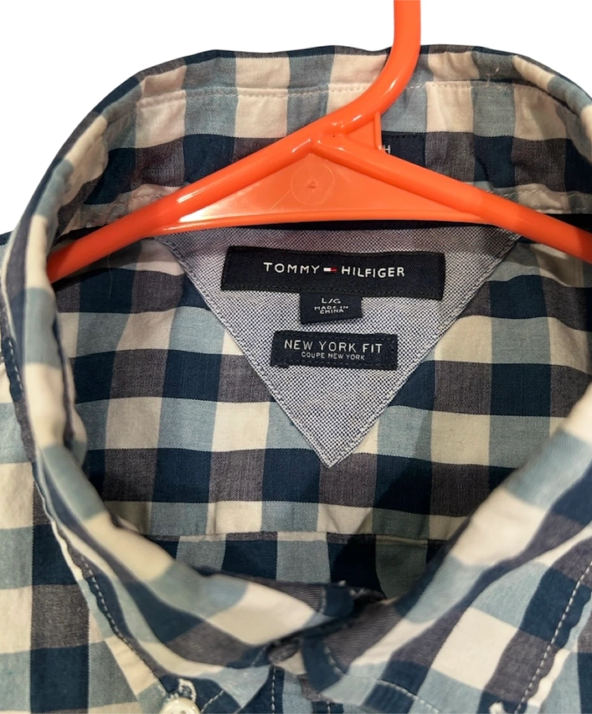Tommy Hilfiger button-down shirt in a blue, white, and grey gingham pattern. It's a size L/G with a New York Fit. Classic collared neckline with button closures.