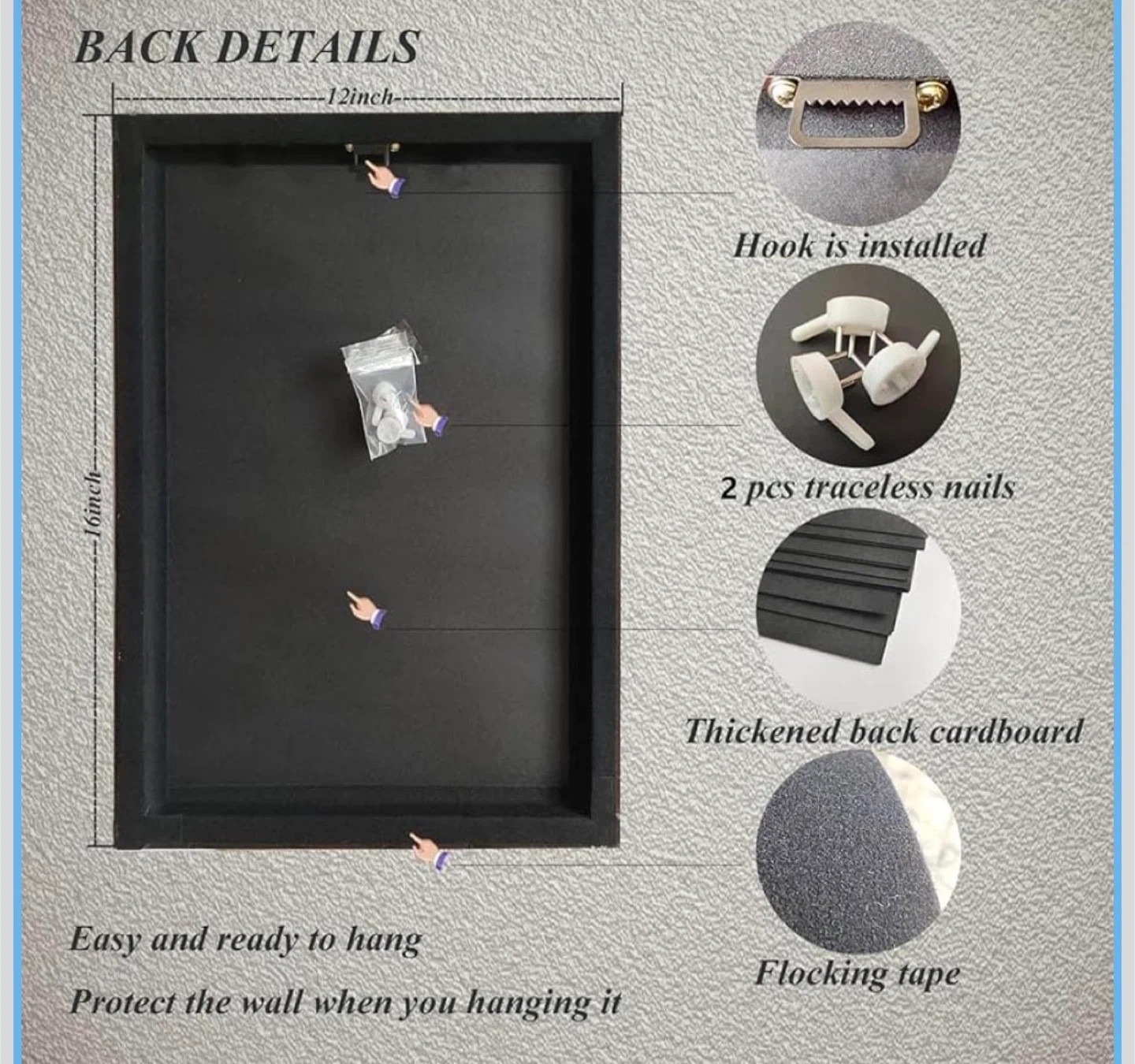 It comes with an installed hook and 2 traceless nails. Easy and ready to hang!