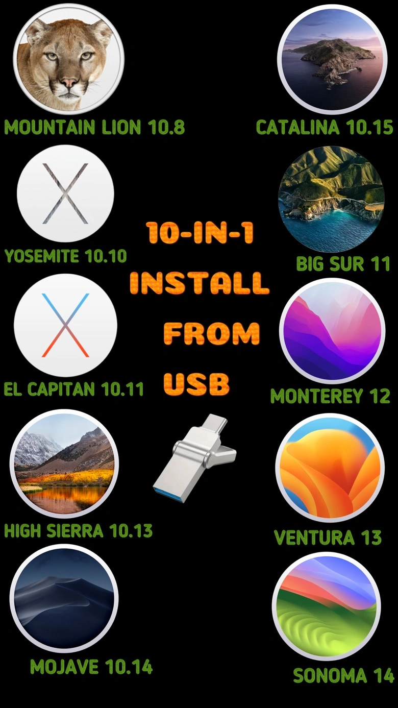20Upgrade or reinstall your Mac with ease using our **128GB Dual USB-C & USB-A 3.2 Bootable Flash Drive**, pre-loaded with 10 versions of macOS, including Mountain Lion, Yosemite, El Capitan, High Sierra, Mojave, Catalina, Big Sur, Monterey, Ventura, and Sonoma. Perfect for fresh installations or reinstalling macOS, this versatile tool is a must-have for MacBook, iMac, and Mac Mini users. Save on professional service fees and revive your device with confidence! **Key Features:** - **Dual USB-C & USB-A 3.2 Connectivity**: Compatible with both older and newer Macs. - **Mac OS 10-in-1**: Install or reinstall 10 different macOS versions. - **128GB Storage Capacity**: Ample space for smooth installation processes. - **DIY Convenience**: Avoid costly technician fees with easy, self-guided installation. - **Comprehensive Instructions**: Step-by-step guidance provided. **Compatibility**: See compatibility photo for details.