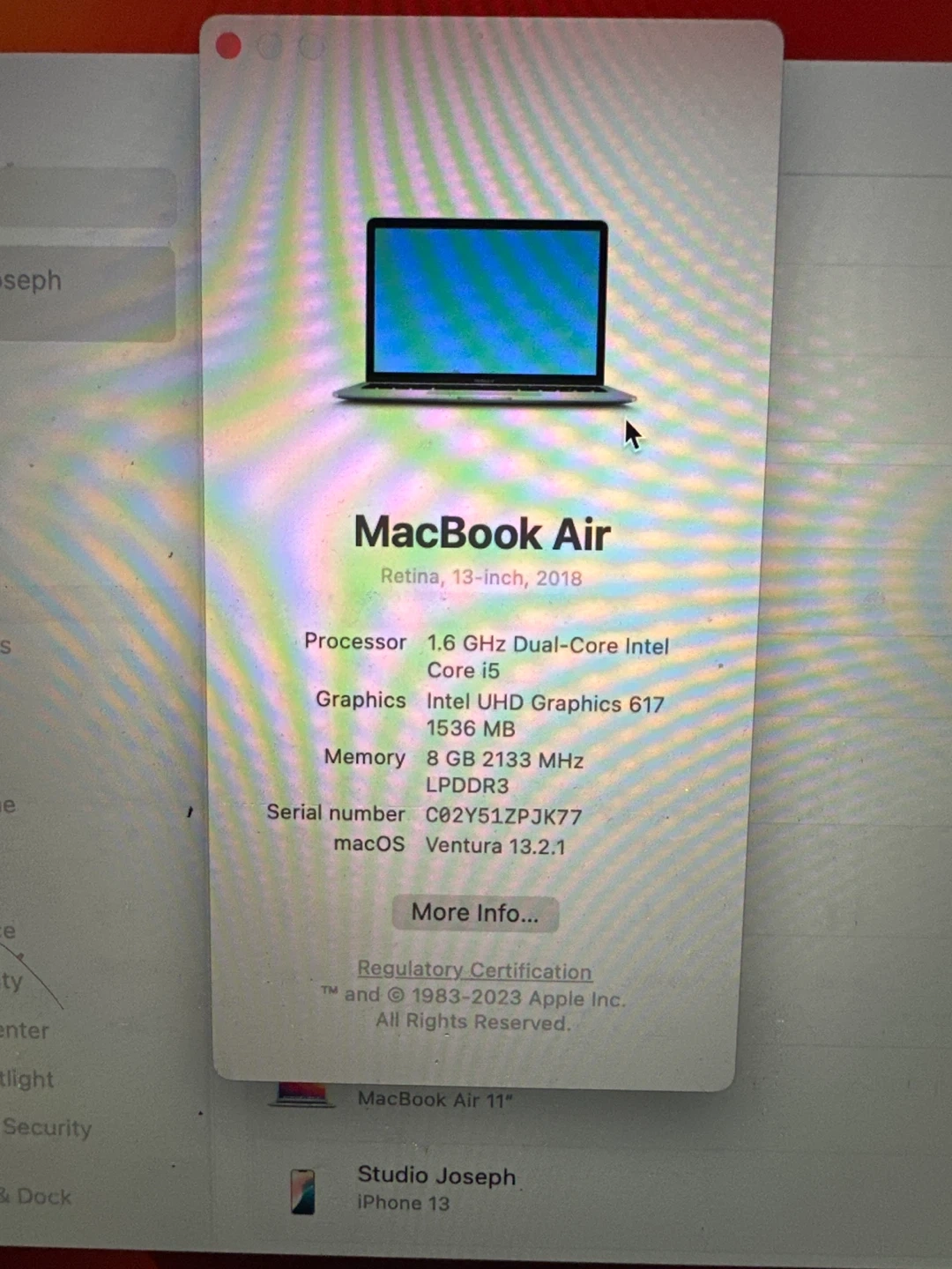 MacBook Air 13โ (2018, Intel i5, 8GB RAM, 128GB SSD) โ Excellent Condition ๐ป Selling my 2018 MacBook Air (Retina Display). Runs smooth and has been factory reset โ ready for the next owner! Specs: โข 1.6GHz Dual-Core Intel Core i5 โข 8GB RAM โข Intel UHD Graphics 617 โข macOS Ventura 13.2.1 โข Battery Condition: Normal (only 316 cycles โ ) Great for school, work, browsing, streaming, or admin tasks. Includes charger, clean keyboard, and bright display. (Priced fairly for condition โ battery health verified)