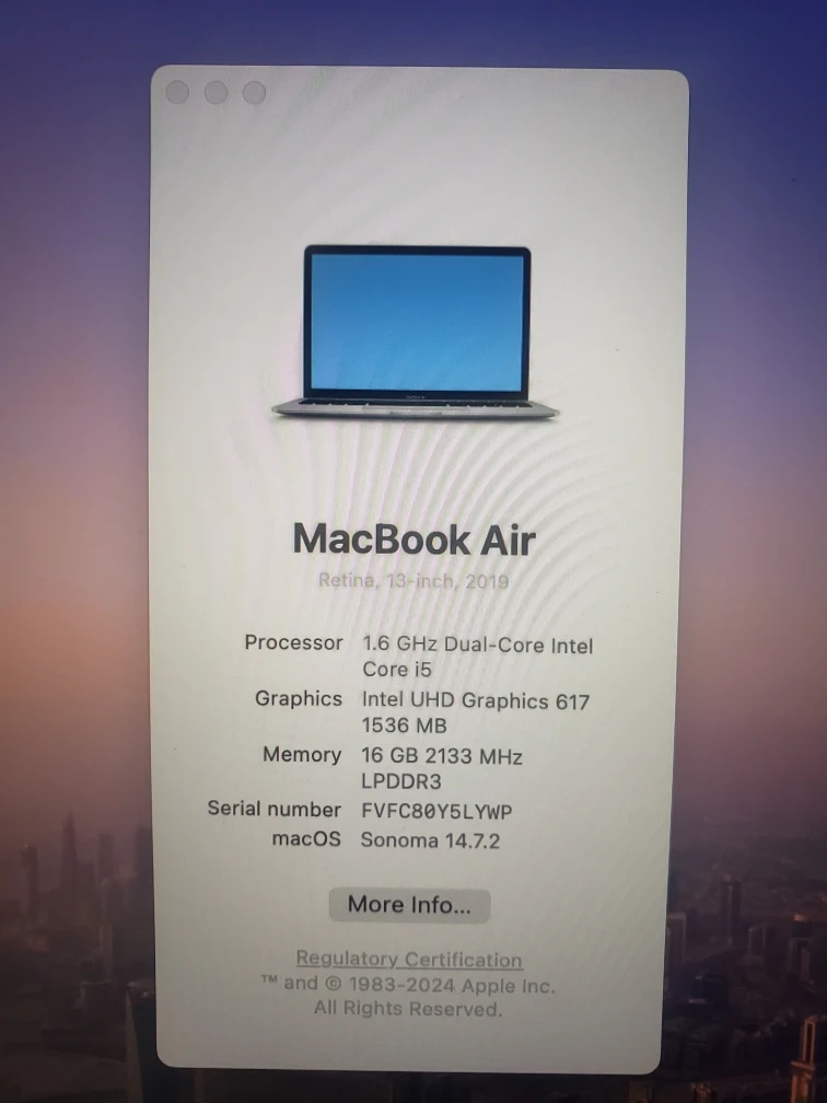 101.6 GHz Dual-Core Intel Core i5, 16 GB RAM, 13-inch Retina display, Sonoma 14.7.2