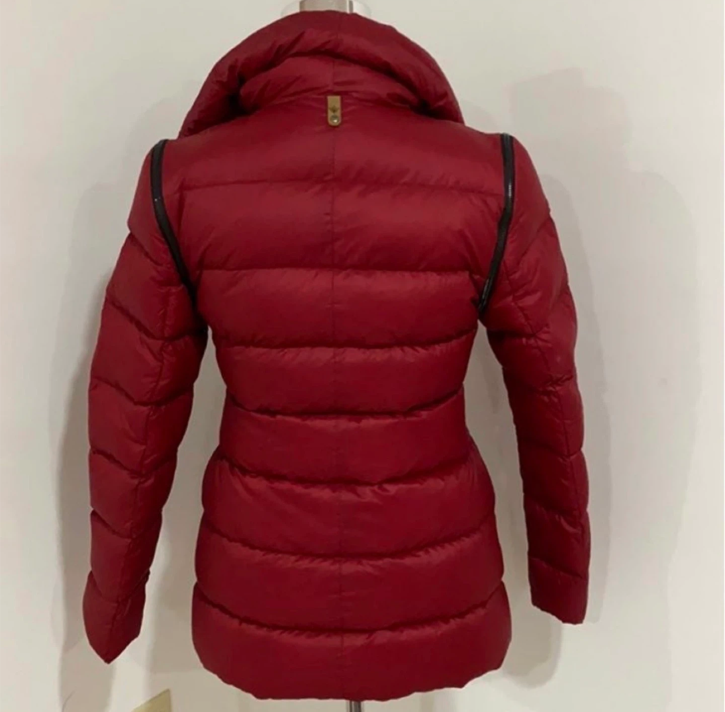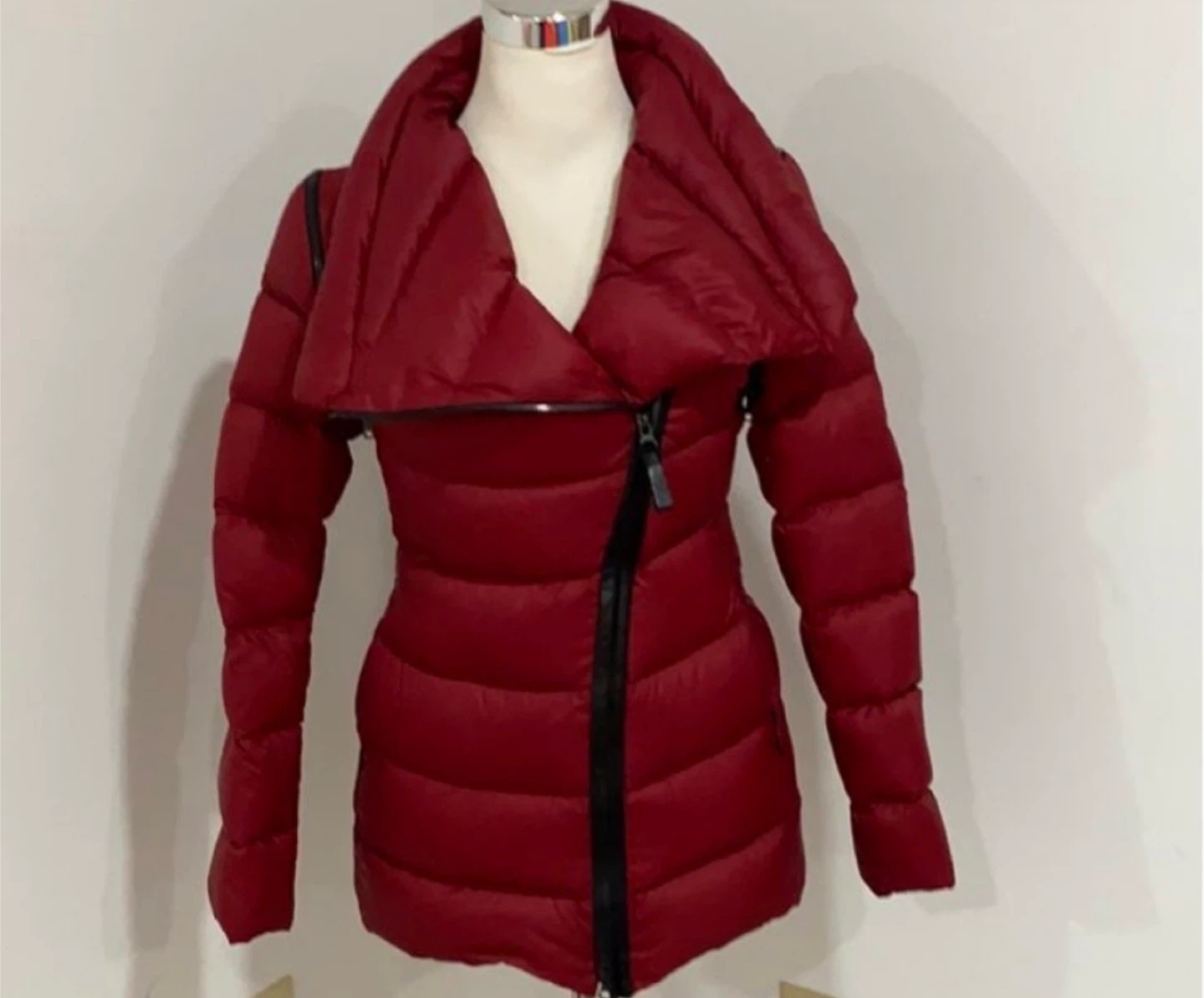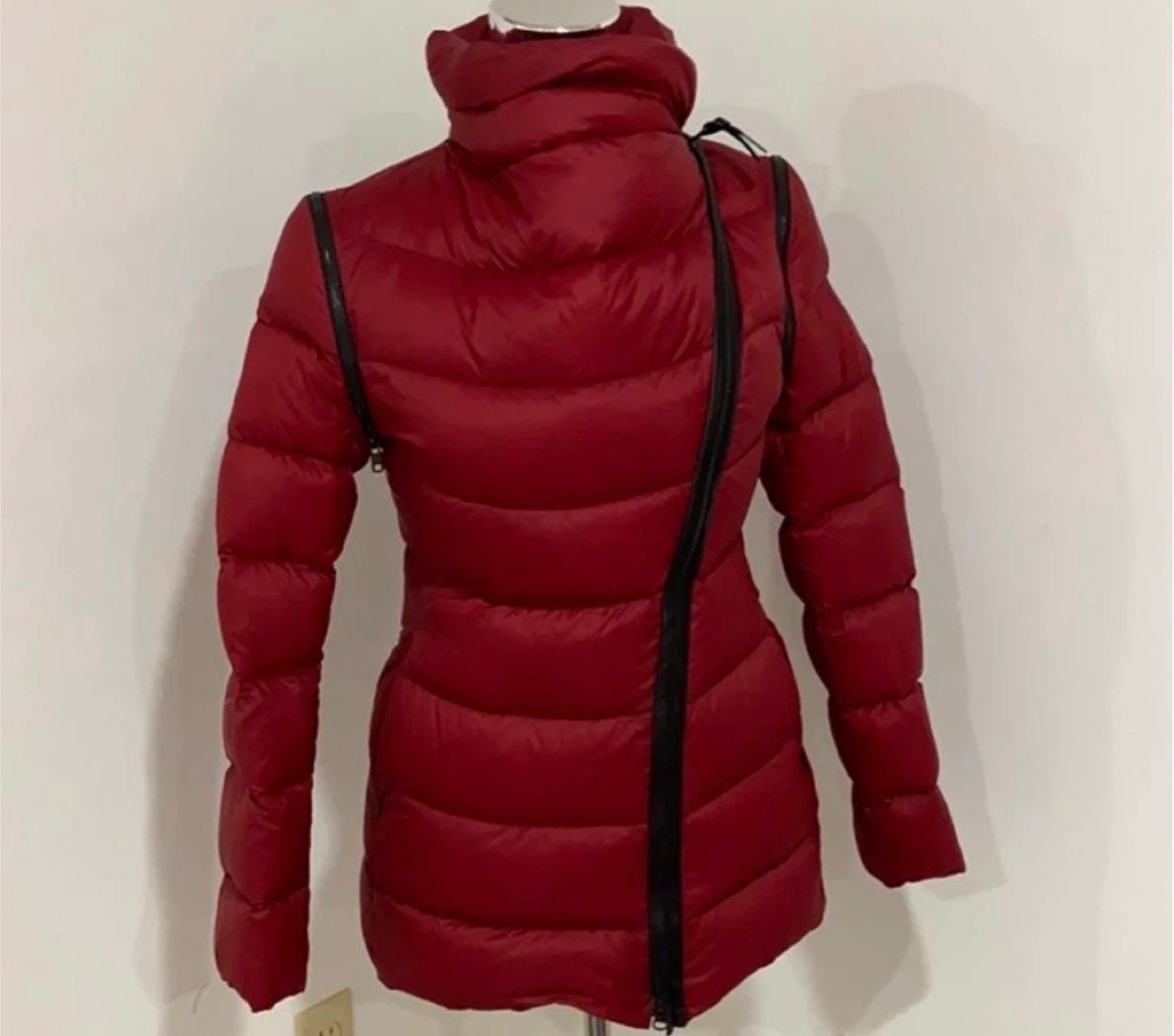 Selling a Mackage puffer jacket in a beautiful red color! It features a unique asymmetrical zipper and a stylish high collar. Perfect for staying warm and fashionable during the colder months