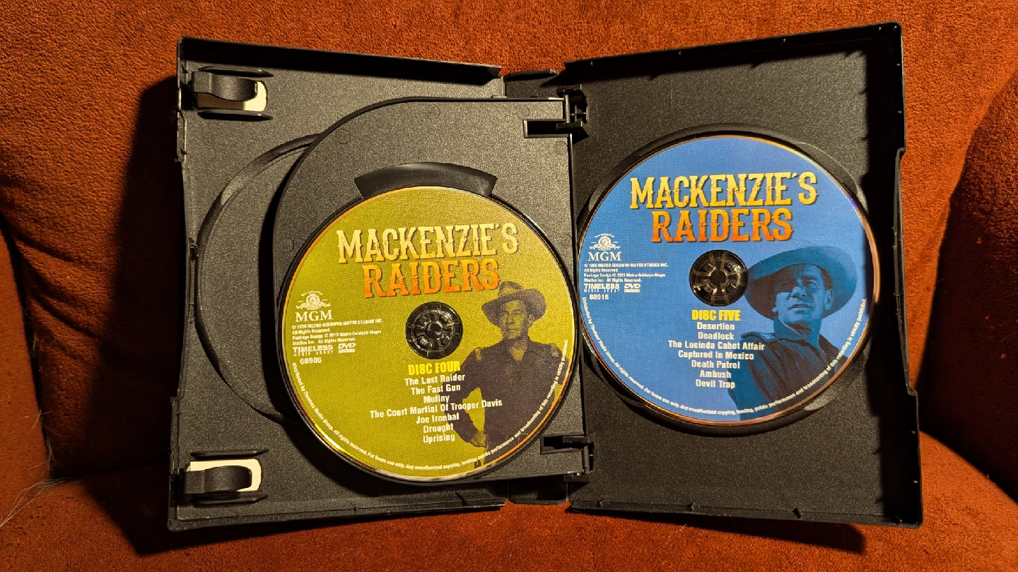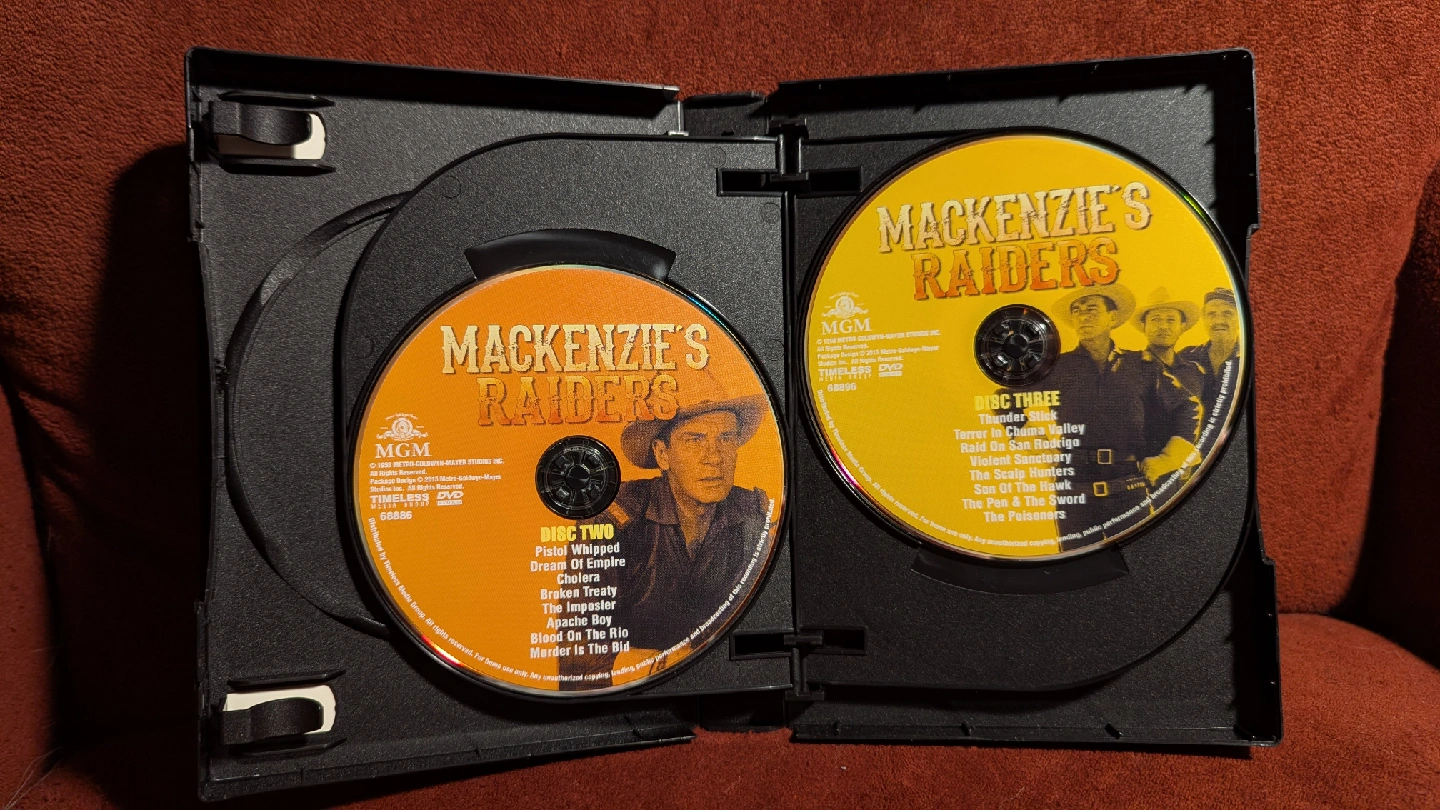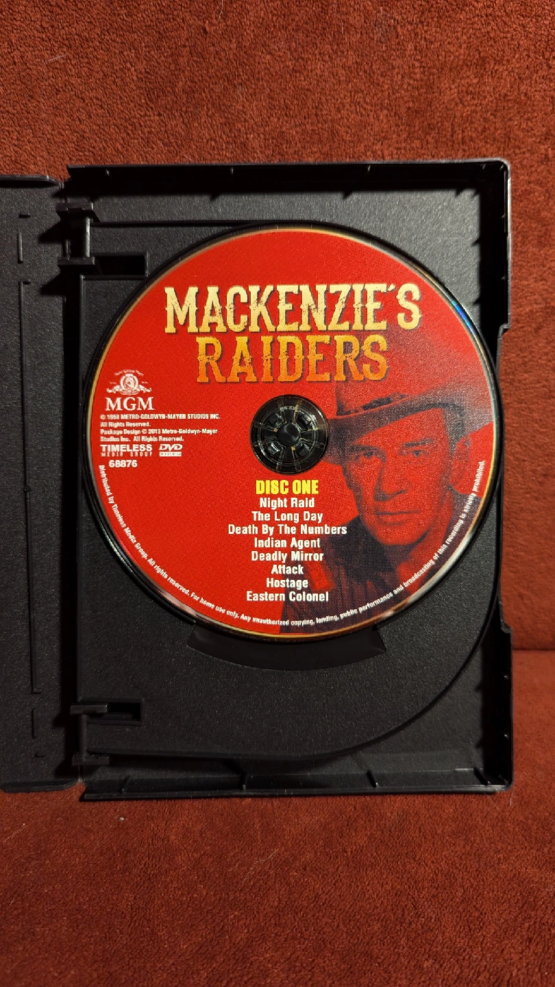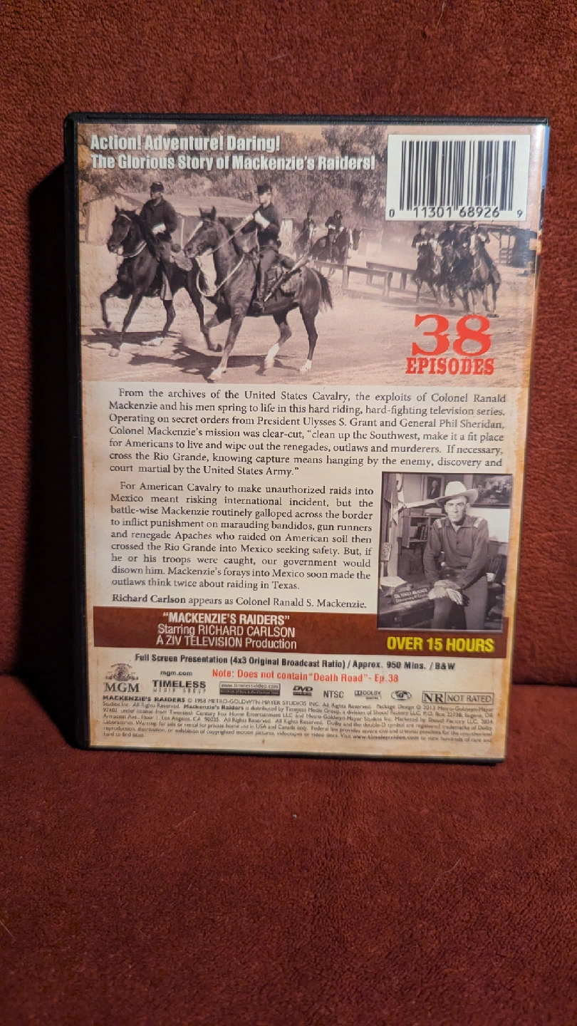 "Mackenzie's Raiders: The Television Series" is a 5-disc DVD box set featuring the complete series of a classic TV western. Richard Carlson as Colonel Ranald S. Mackenzie. From the archives of the United States Cavalry. This set includes all episodes of the popular show in a tall DVD case, with a total runtime of approx. 950 minutes (over 15 hours) of entertainment. With a rating of NR and English language options, this collection is perfect for fans of western genre TV series. The Timeless Media studio brings this timeless classic to life, making it a must-have for collectors and enthusiasts of vintage television programming. Full Screen Presentation (4x3 original broadcast ratio), B&W.