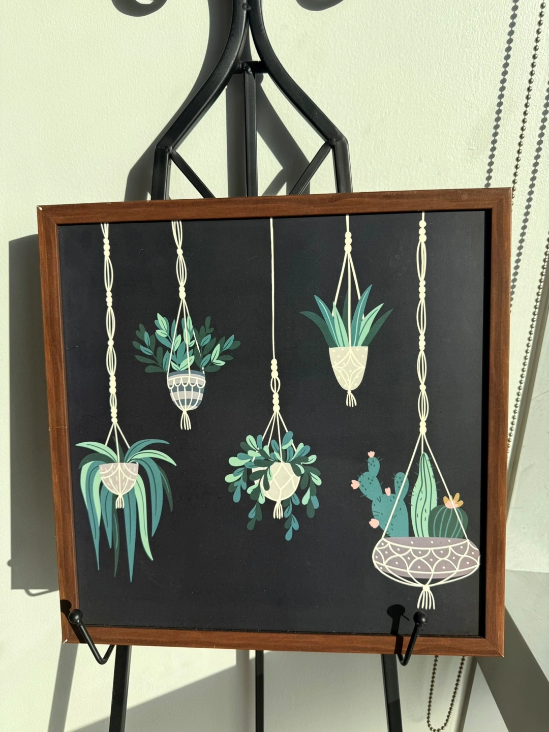 95Square framed canvas print. Dark background. Features various plants in macrame hanging planters. Perfect for boho decor.