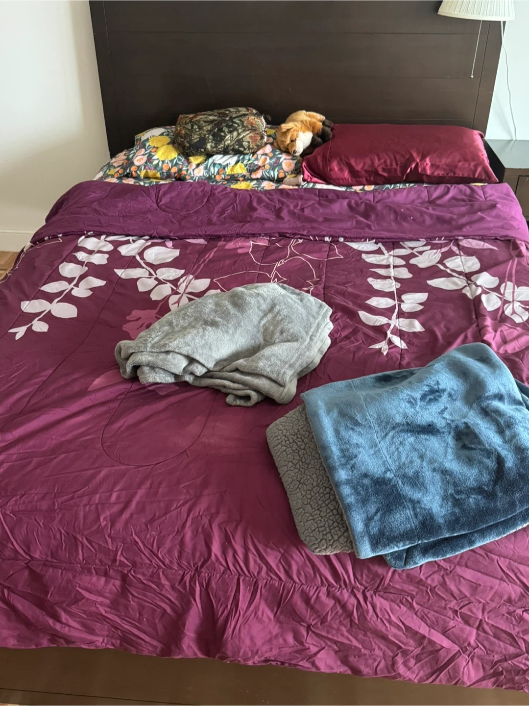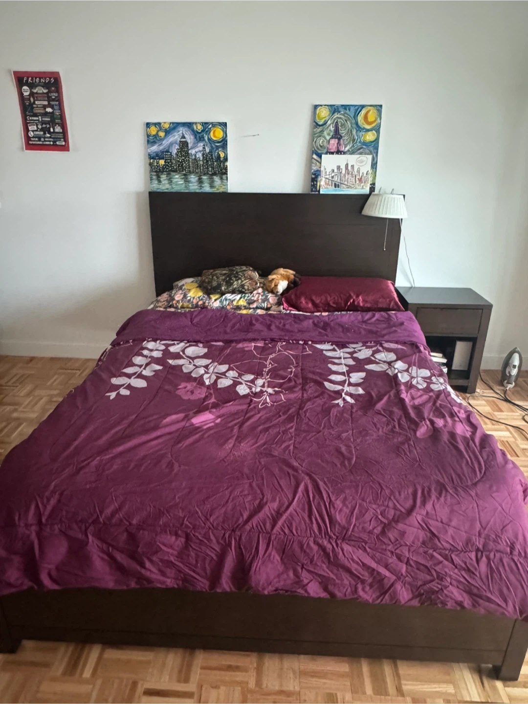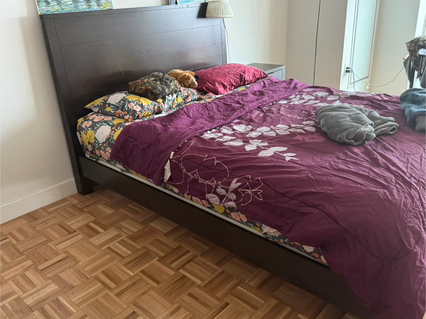 18Solid wood queen bed (approx. 60”L x 50”W x 15”H) from Macy’s with sturdy headboard and included mattress. Quality build, extremely sturdy with slight normal wear and tear. Comfortable and clean. Pickup only. Sold separately or with full furniture set. Original value $700!!!
