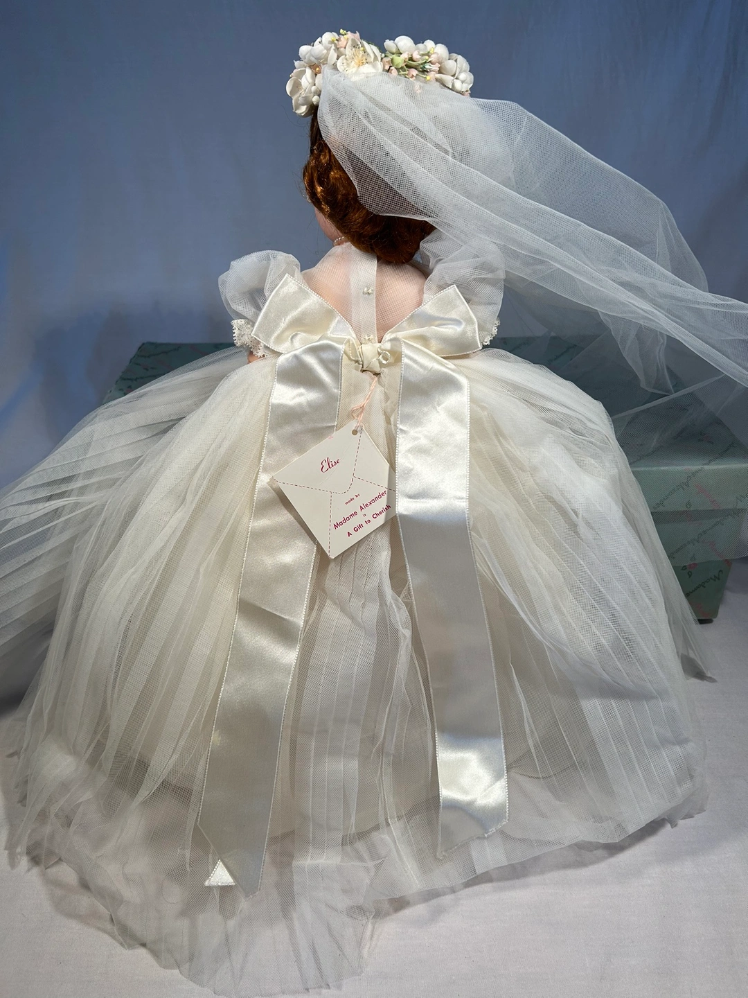 Collectible, pristine brunette Elise bride doll. All jewelry, undergarments, shoes & accessories are in perfect condition. Blue eyes open & close. All joints bend. Original box & tag, including packing materials & tissue. Purchased at Marshall Field & Company - State Street store - Christmas 1958. Special and very beautiful keepsake. Most certainly can be played with! *Have same doll in same condition with same dress BUT pale pink. FIRM PRICE Cash only, plz.