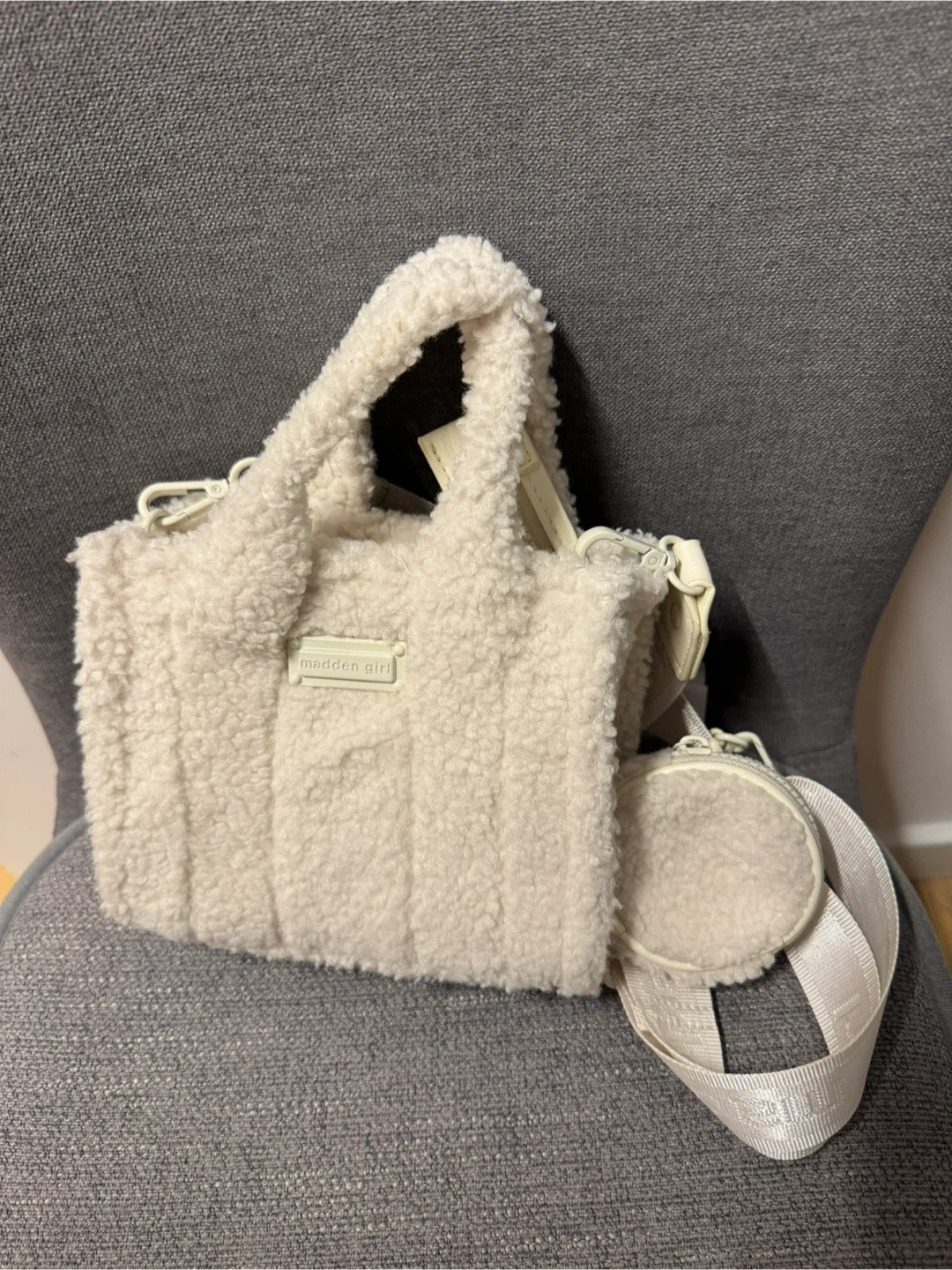 65Super cute Madden Girl mini tote bag in a cream sherpa material! It comes with a small, detachable coin purse and a longer strap so you can wear it as a crossbody. Perfect for adding a fun, textured touch to any outfit