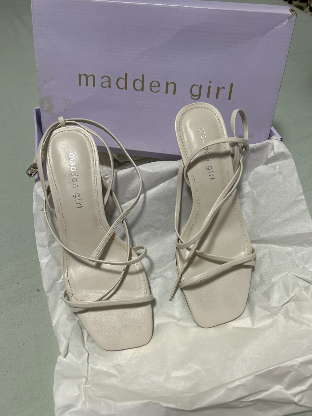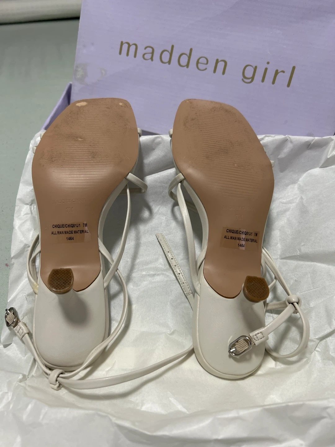 47Selling a pair of Madden Girl heels in a size 7. They are white and come with the original box. The heels show some signs of wear on the soles, but are otherwise in good condition! π