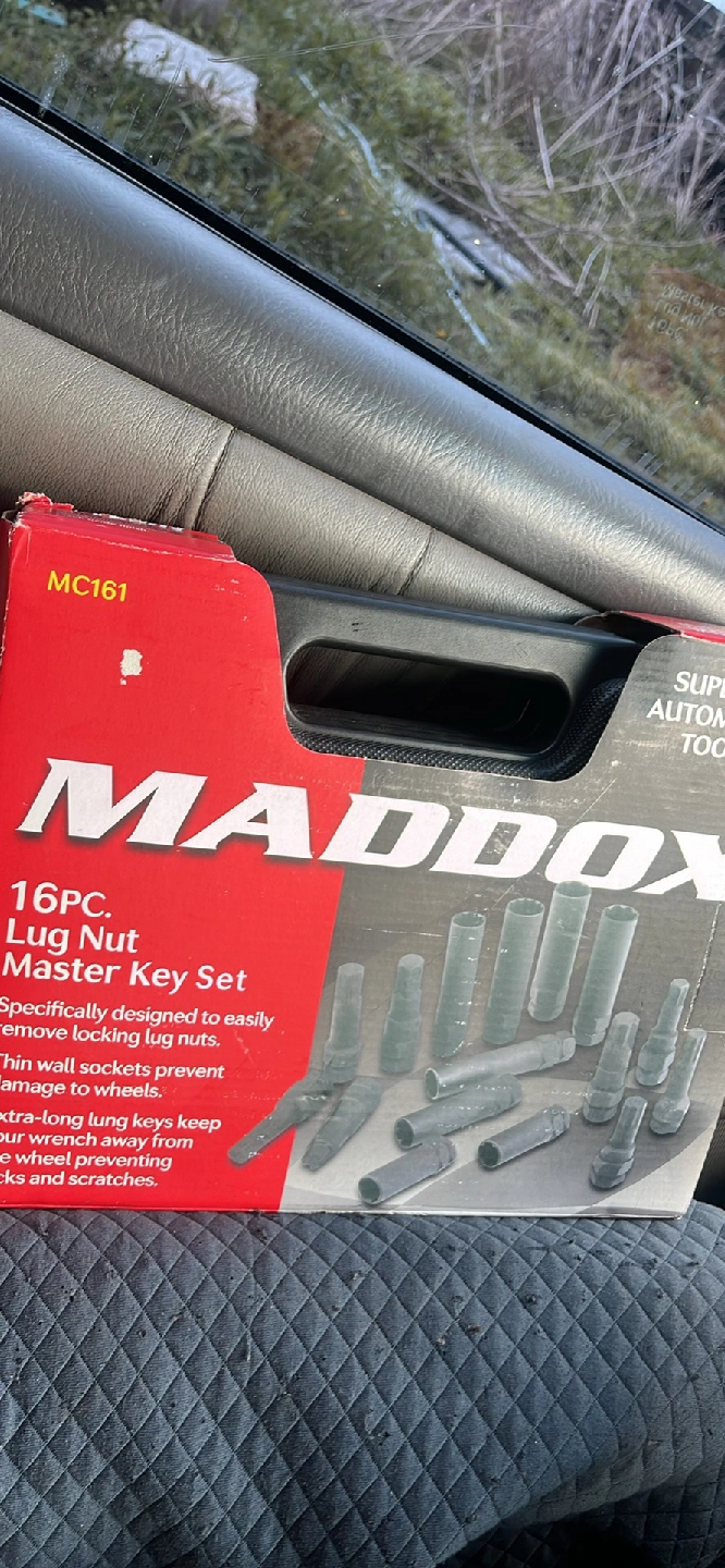 Selling a Maddox 16-piece Lug Nut Master Key Set. This set is specifically designed to easily remove locking lug nuts. The thin wall sockets prevent damage to wheels. The extra-long lug keys keep your wrench away from the wheel, preventing nicks and scratches