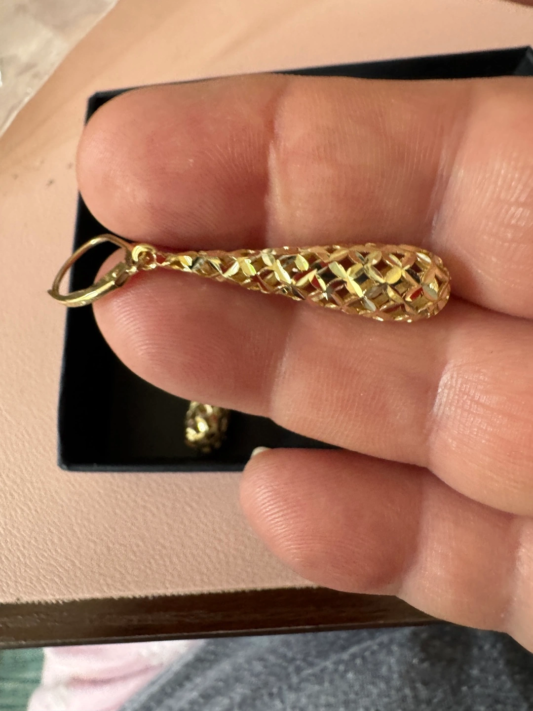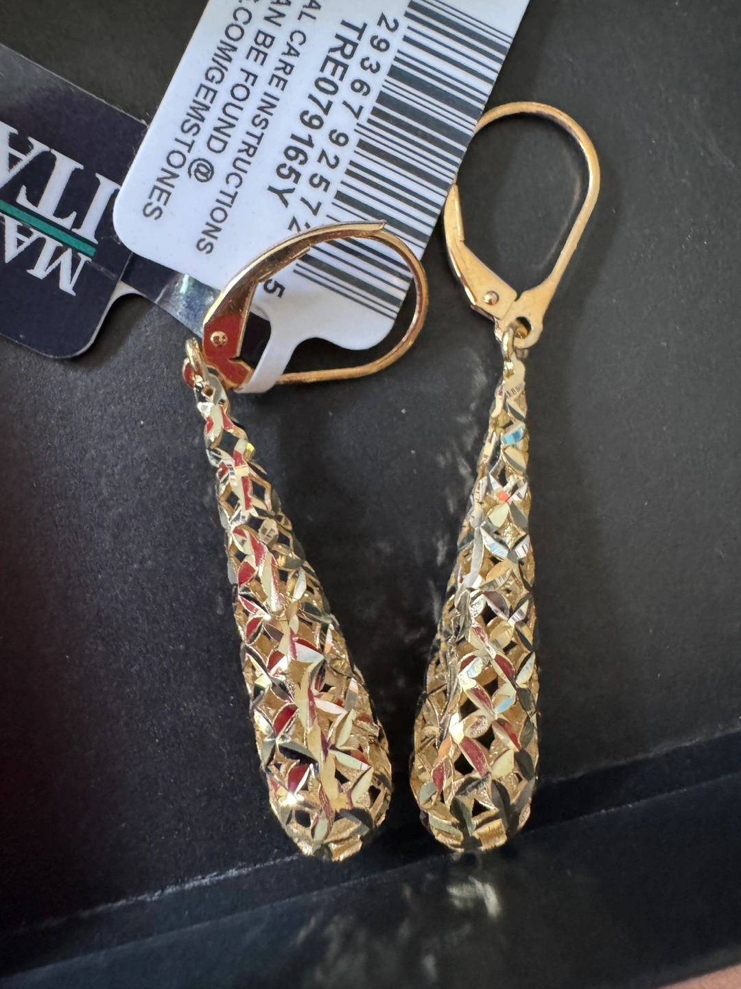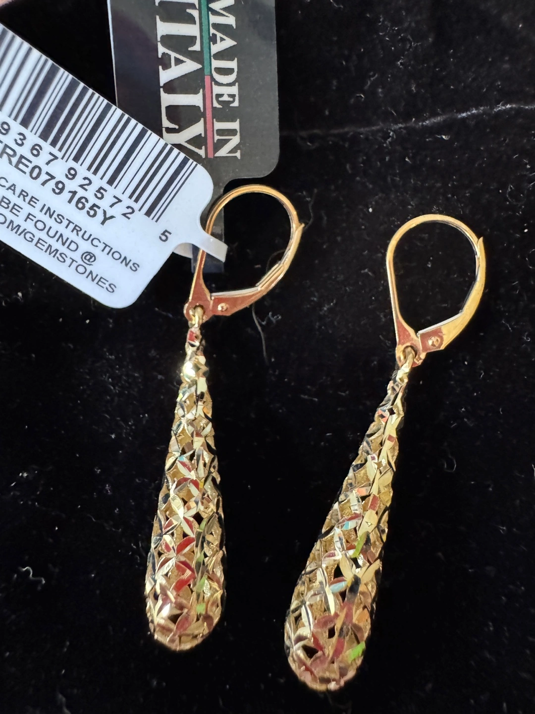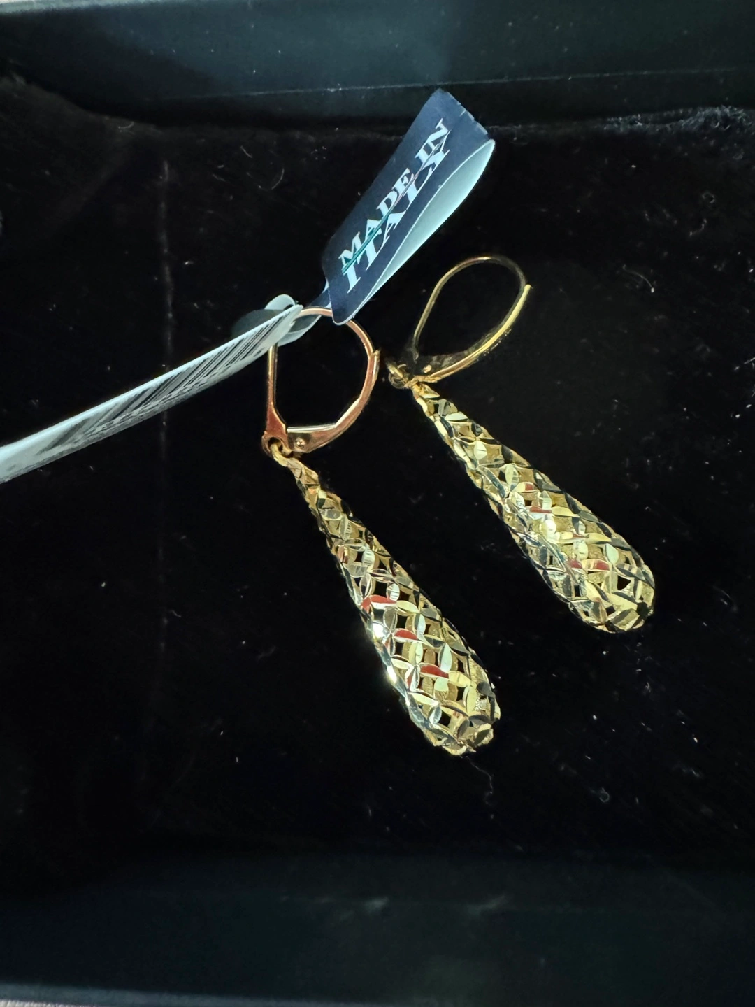 Selling a pair of gold dangle earrings made in Italy. These earrings have a unique, textured design that catches the light beautifully. They are in excellent condition and come with the original tag. Perfect for adding a touch of elegance to any outfit!