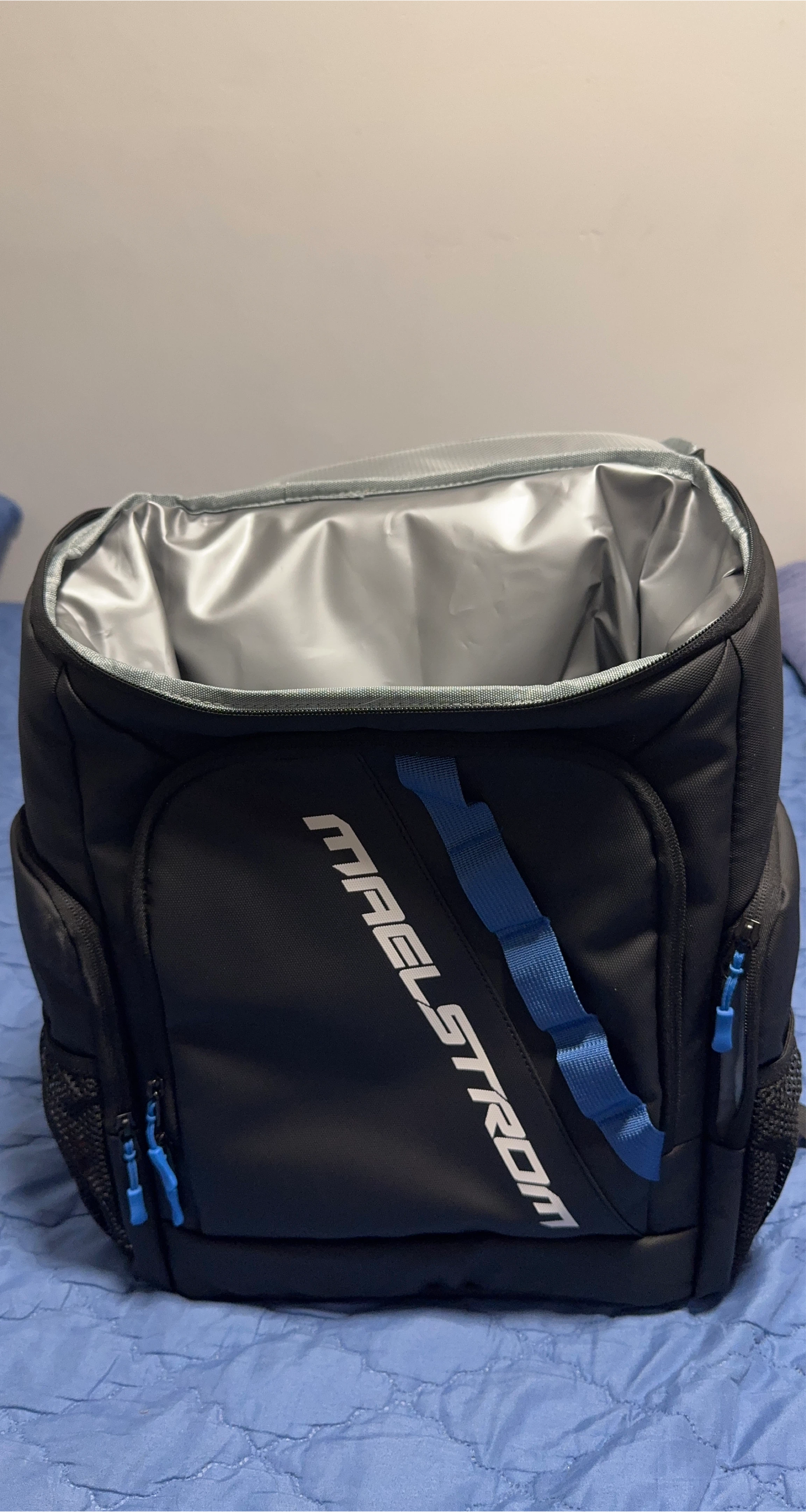 69This is a MAELSTROM black insulated lunch bag. It appears to be in good condition with a silver lining inside. The bag has blue accents and zippers.