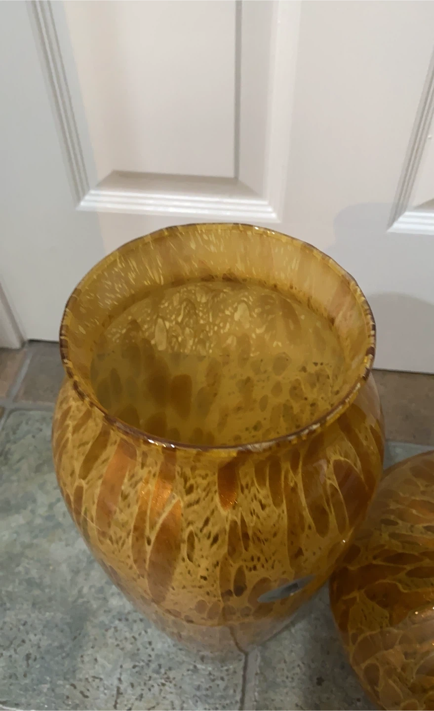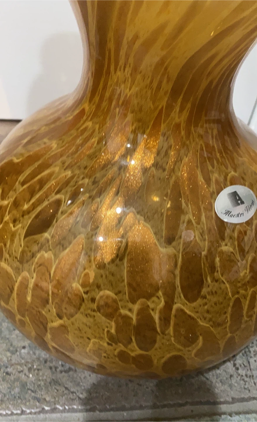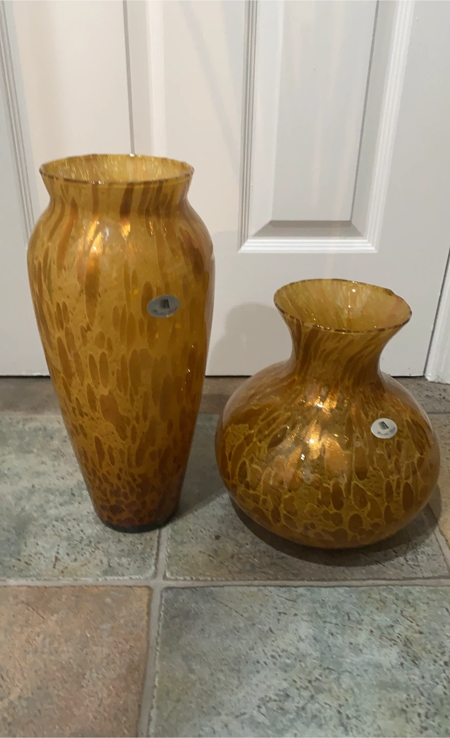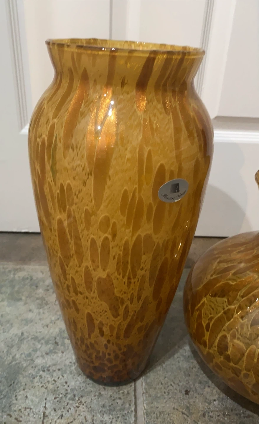 Selling a beautiful set of amber art glass vases from Maestri Vetrai. They have a unique, textured design that catches the light nicely. The vases are in great condition and would make a lovely addition to any home