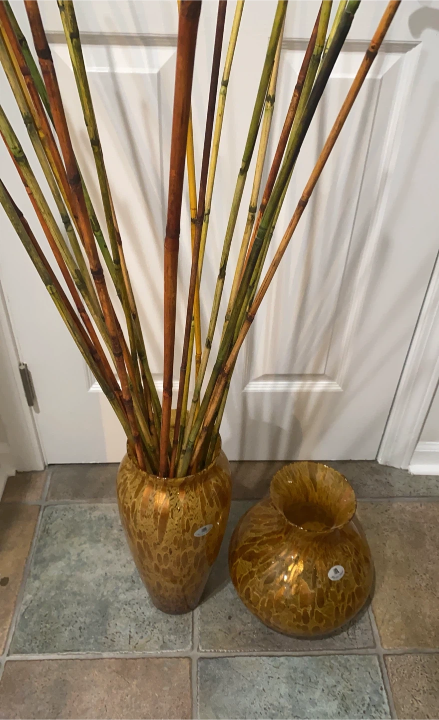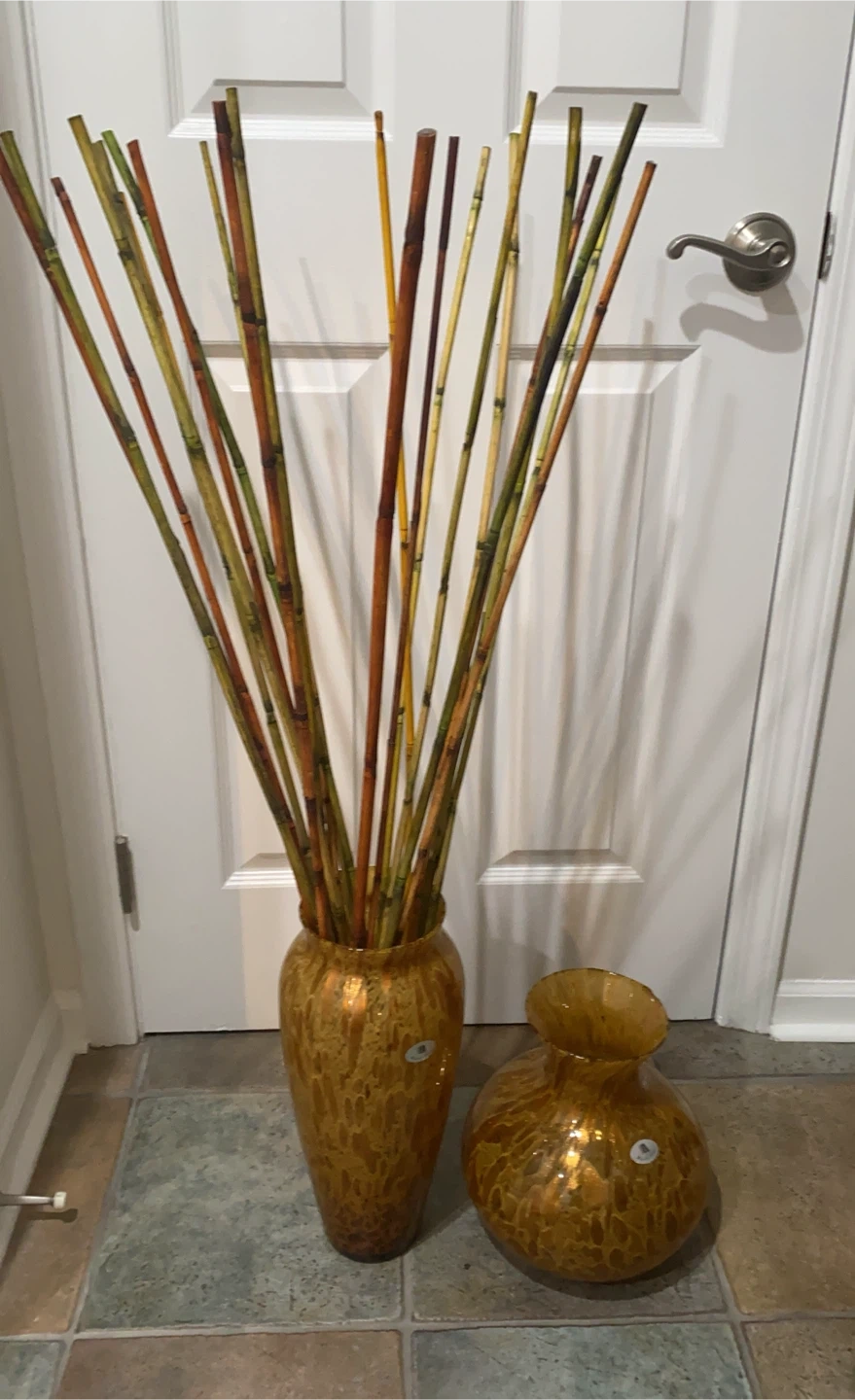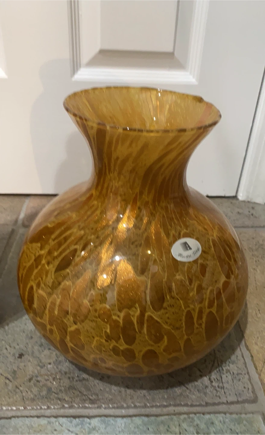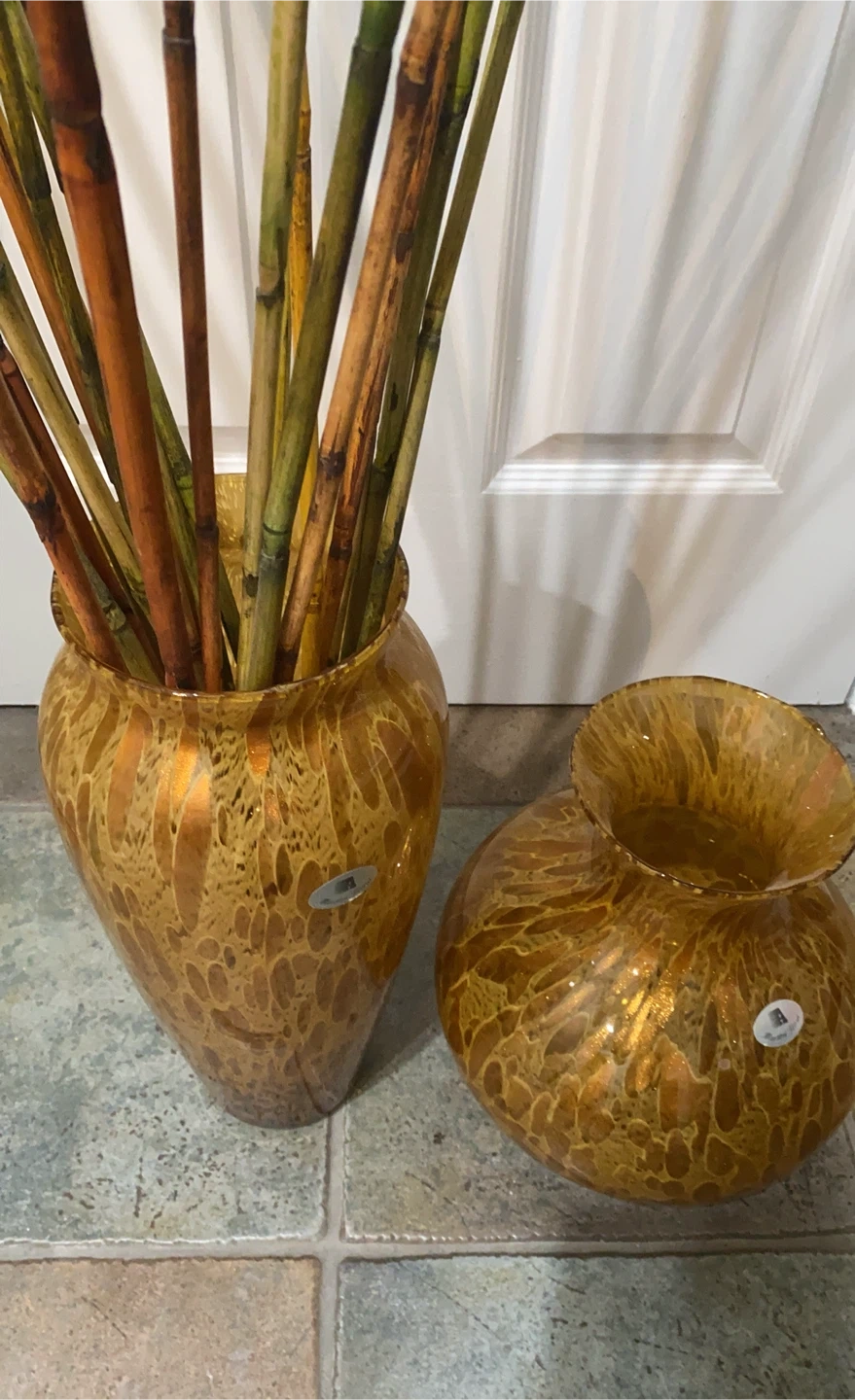 Selling a beautiful set of amber art glass vases from Maestri Vetrai. They have a unique, textured design that catches the light nicely. The vases are in great condition and would make a lovely addition to any home