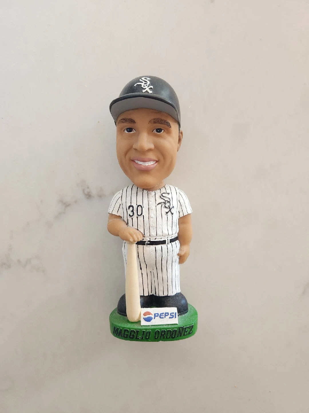 5Here's a Magglio Ordonez bobblehead, featuring him in his Chicago White Sox uniform. It has the number 30 on the front and the White Sox logo on the hat and uniform. The base has the Pepsi logo and his name.