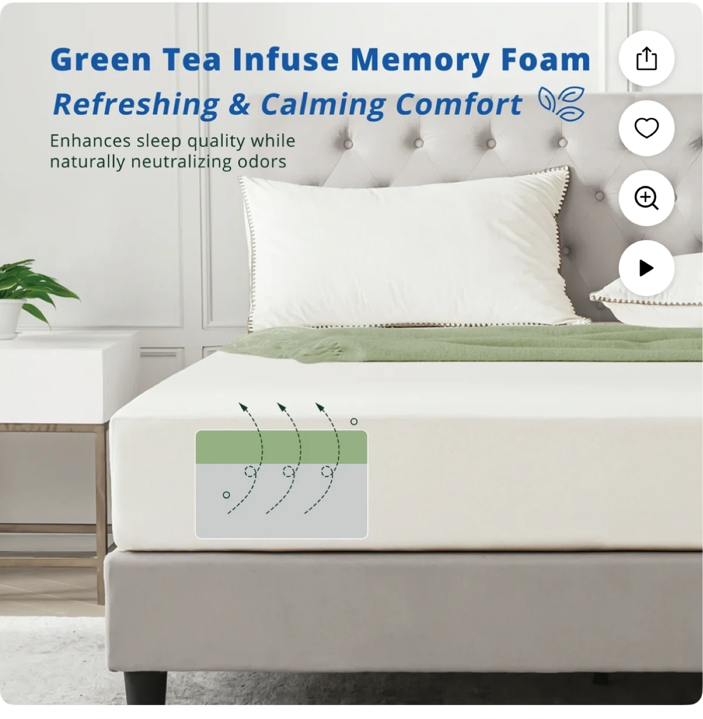 0Get ready for a refreshing and calming sleep with this Mainstays Green Tea Infused Memory Foam Mattress! It enhances sleep quality while naturally neutralizing odors. It's designed to be medium firm and can be placed on a platform, metal grid, box spring, slatted base, or adjustable base