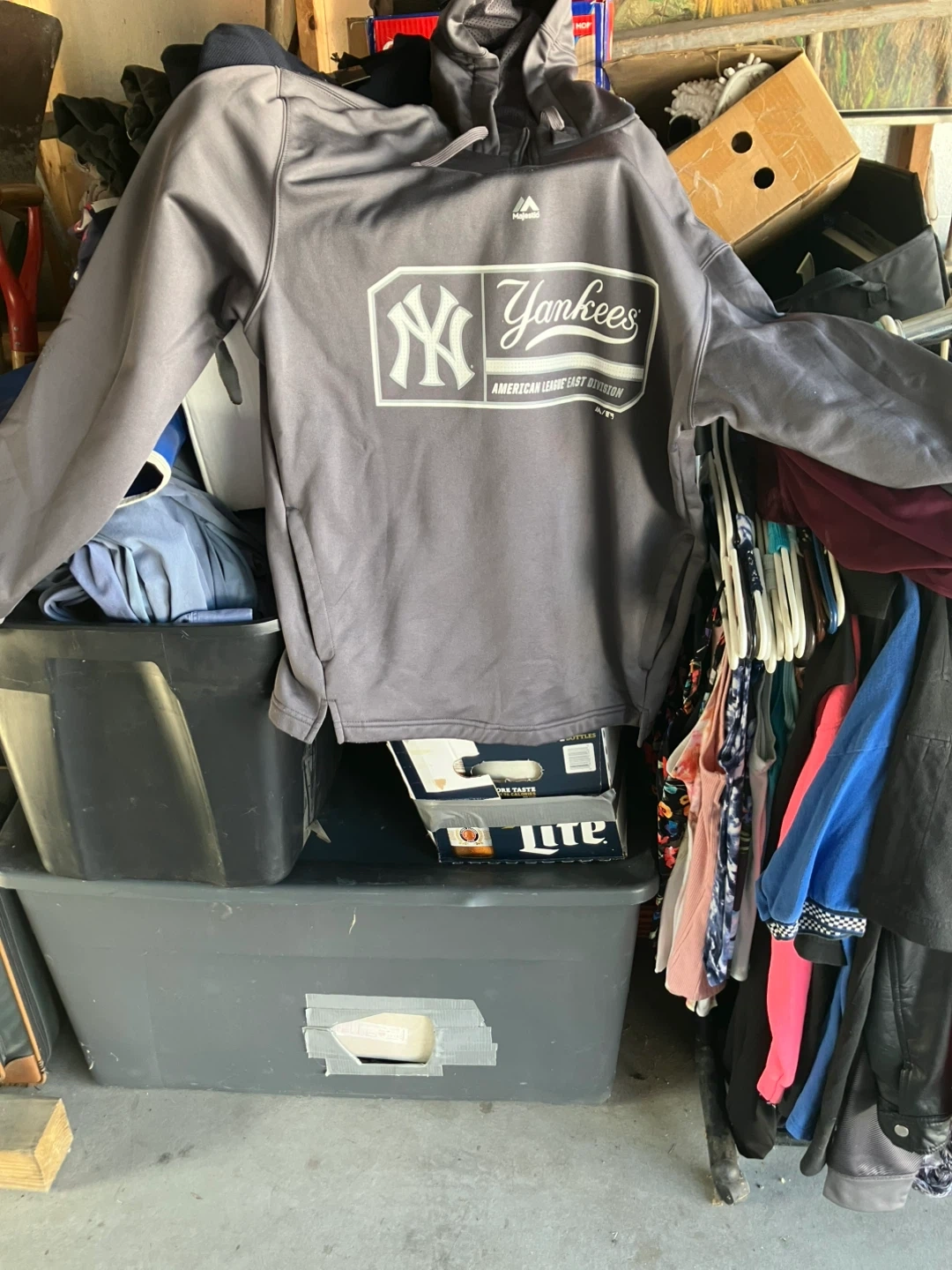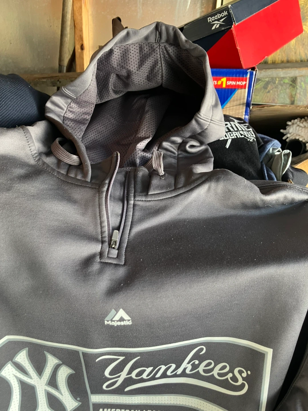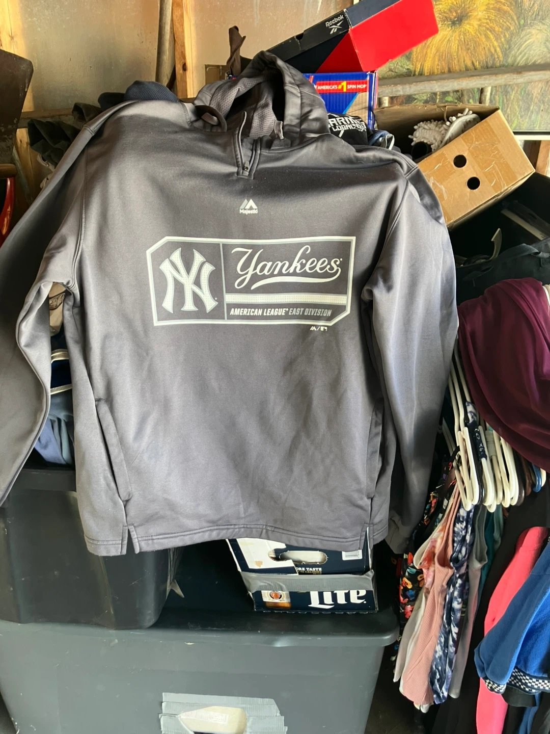Selling a Majestic Yankees hoodie in size L. It features the classic Yankees logo and is in good condition. Perfect for any baseball fan!