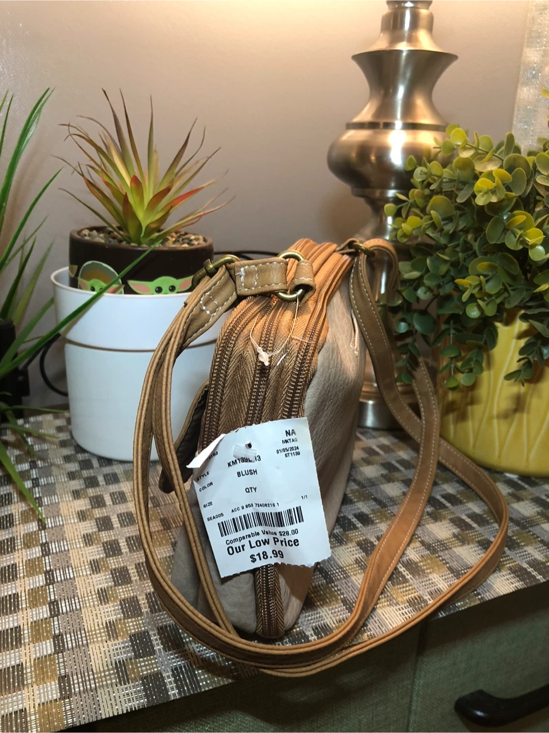 Malia Sac crossbody bag in a beautiful blush color! This stylish bag is perfect for everyday use and has plenty of room for your essentials. The tag shows 'Our Low Price' at $18.99