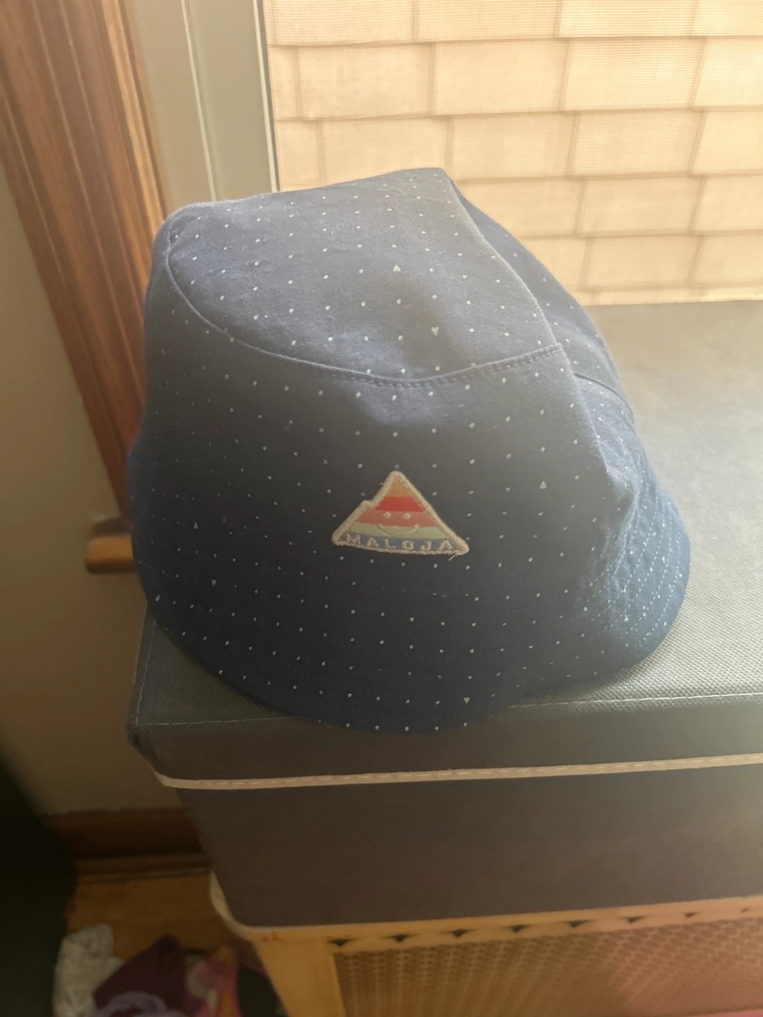I'm selling a Maloja bucket hat. It's a dark blue color with a subtle white polka dot pattern. The hat features the Maloja logo on the front. It's in great condition and ready for a new owner!