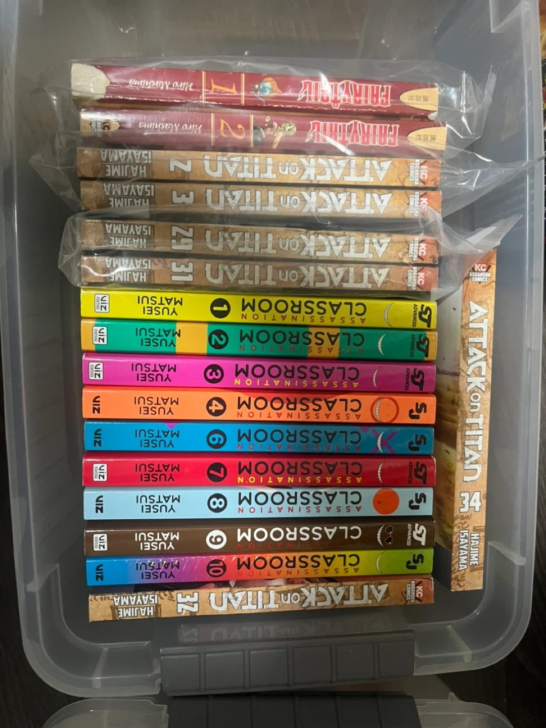 Selling a manga lot that includes: - Attack on Titan volumes - Fairy Tail volumes - Classroom Assassination volumes Selling as a bundle including AOT, fairy tail and assassination classroom Most are in good condition around 7 of them are poor to decent condition on the cover no missing pages