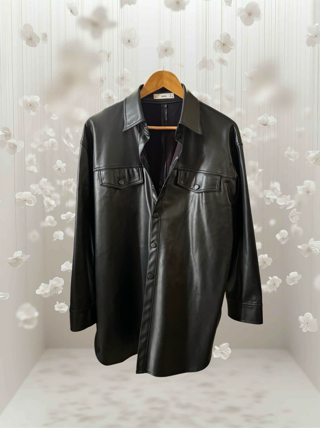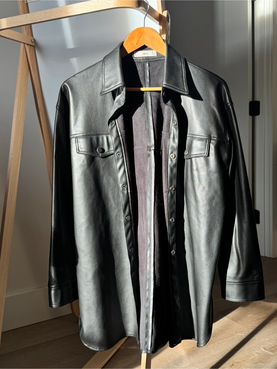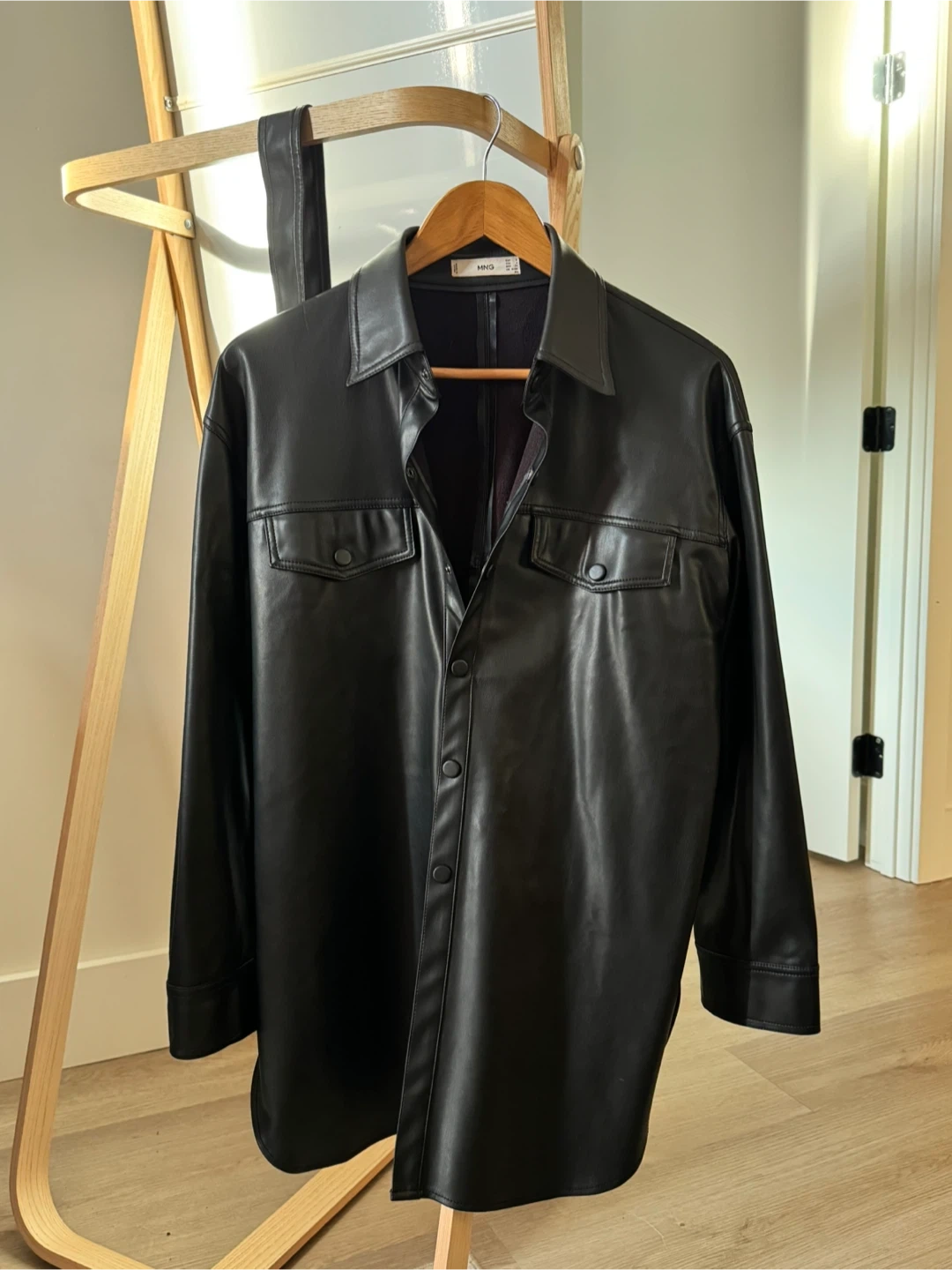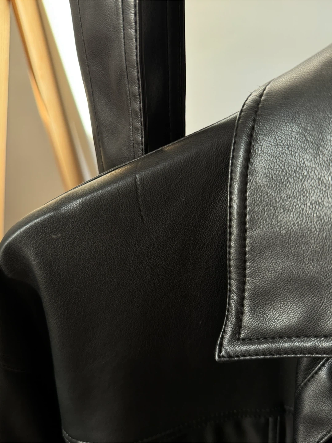25Oversized black faux leather shirt with a belt The material looks just like real leather and feels soft and high-quality. Small scratch on the shoulder (photo)