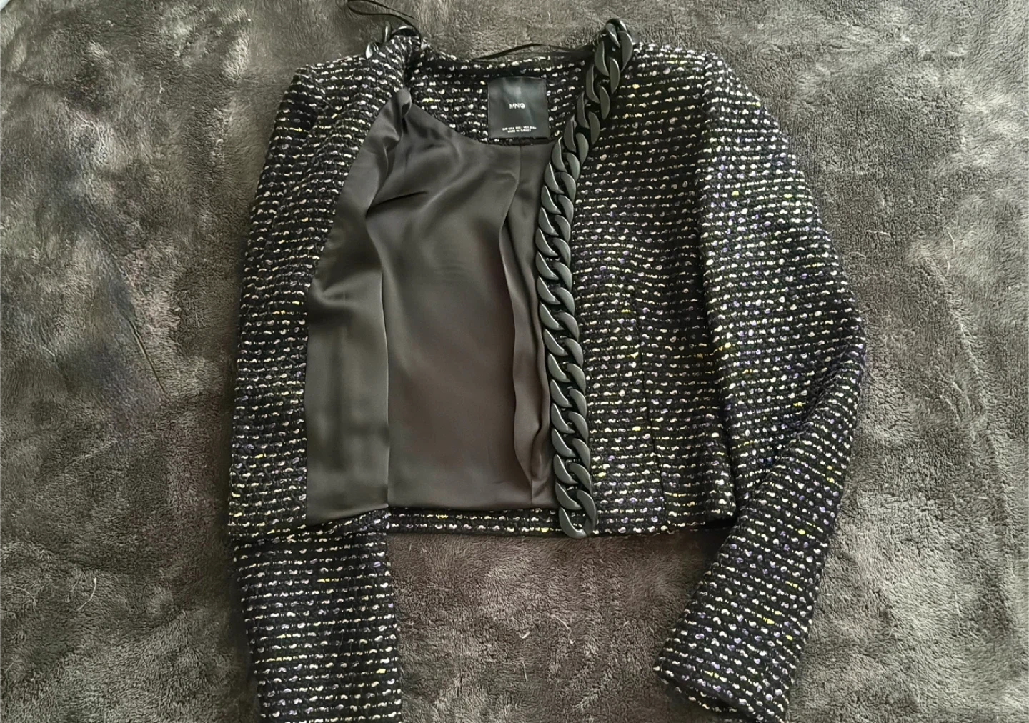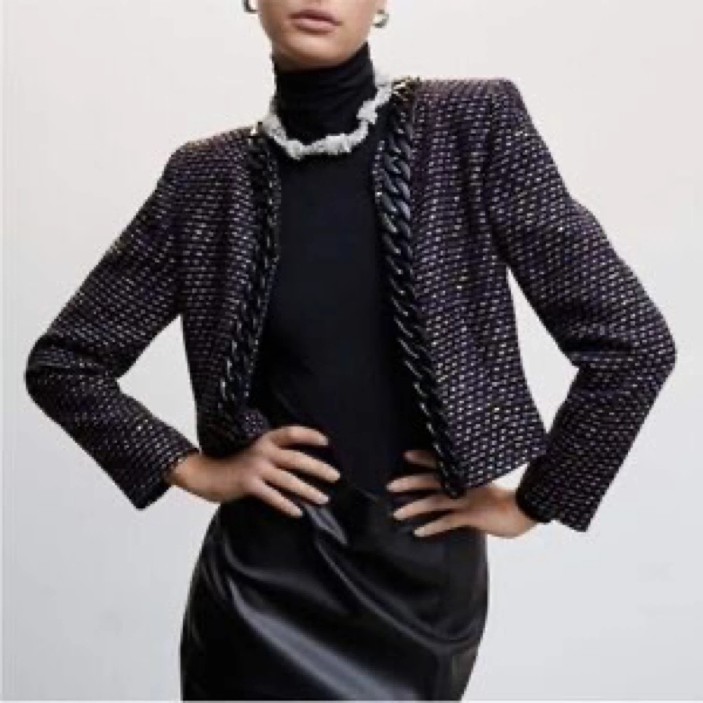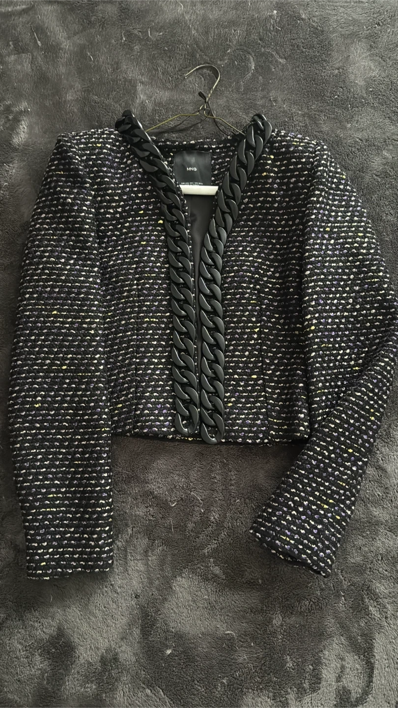This is a beautiful tweed jacket from Mango! It's in great condition and has a unique chain detail around the collar. Perfect for dressing up or down!