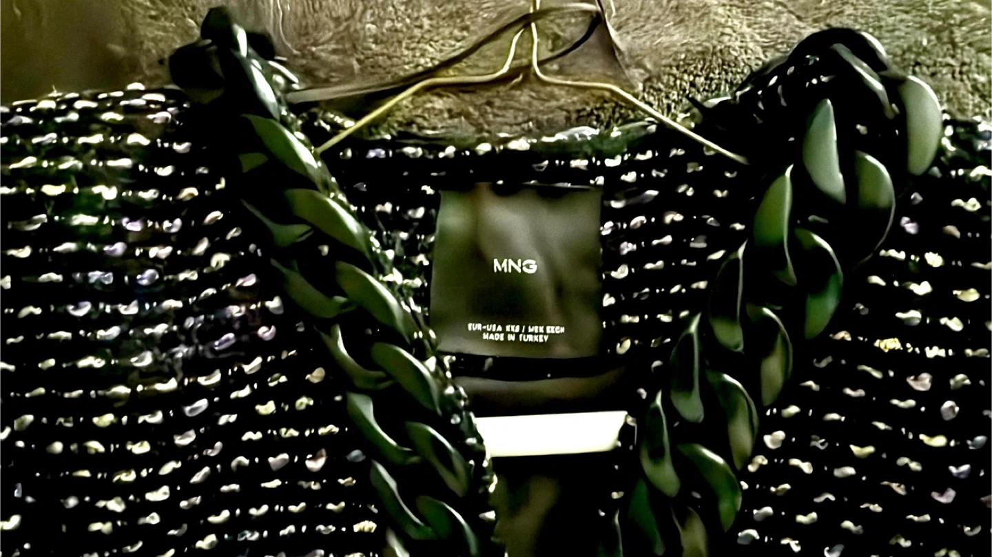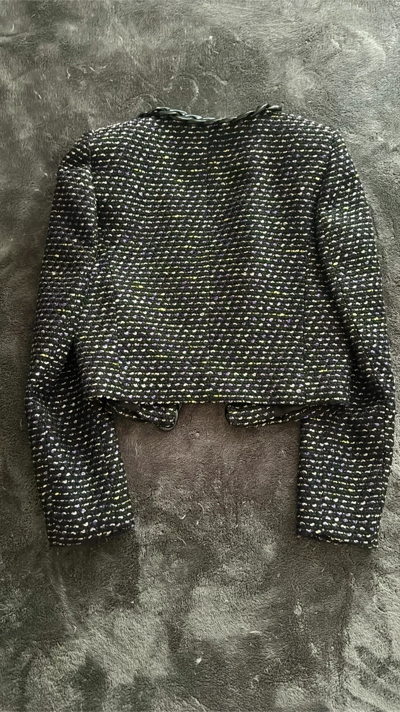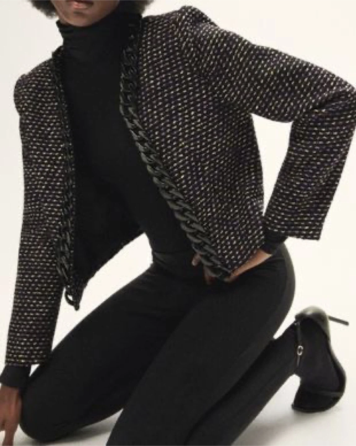 This is a beautiful tweed jacket from Mango! It's in great condition and has a unique chain detail around the collar. Perfect for dressing up or down!