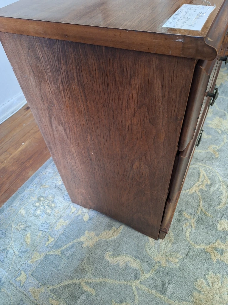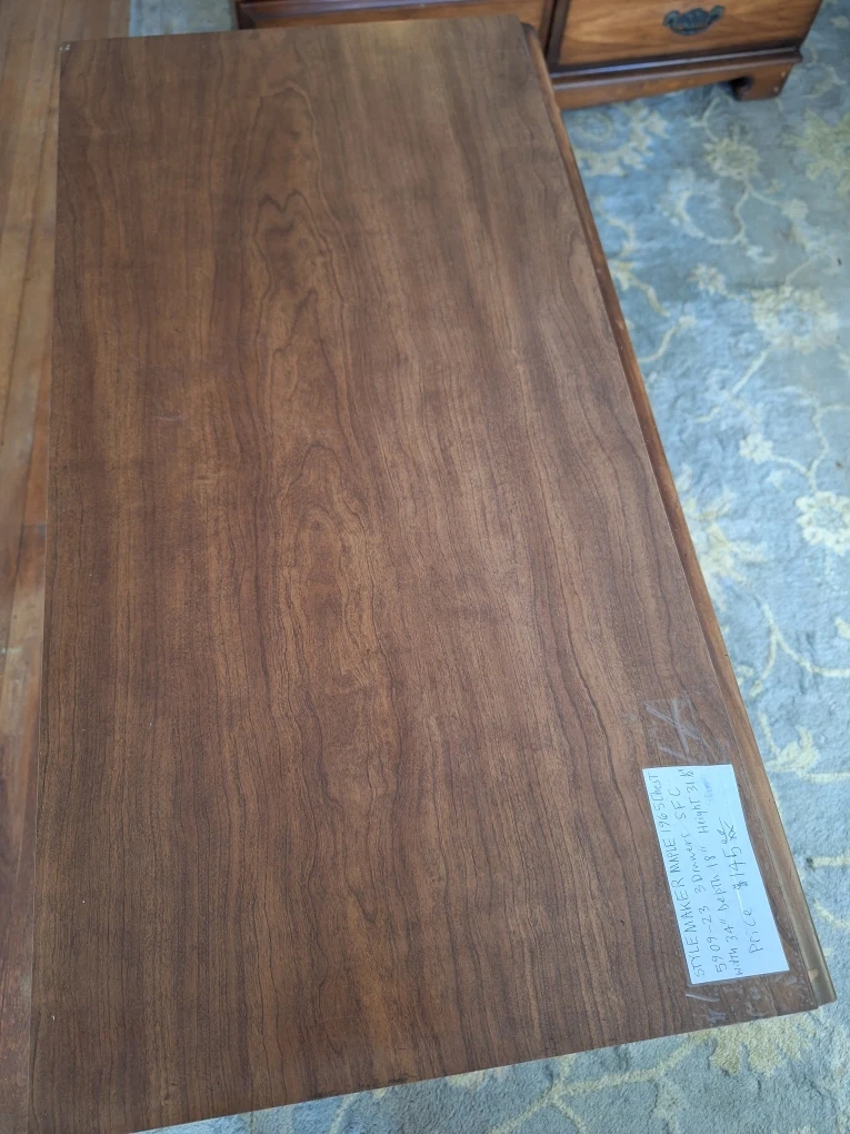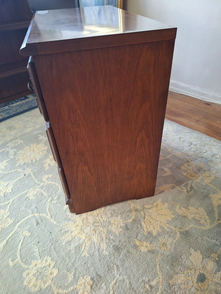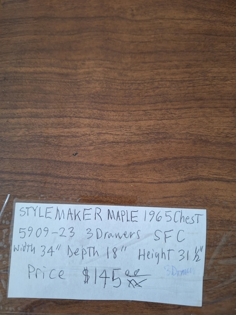 This 1965 VINTAGE MIDCENTURY STYLEMAKER MAPLE dresser offers ample storage with five drawers. It's made of wood with decorative metal drawer pulls. Perfect for organizing clothing and accessories.