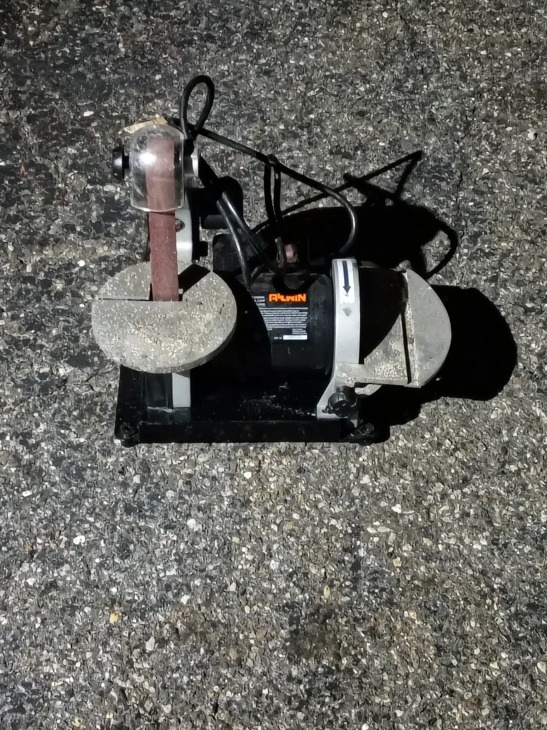 This is a bench grinder with a belt sander attachment. It's ideal for sharpening tools and light sanding tasks. The grinder has a wheel for grinding and a belt for sanding.