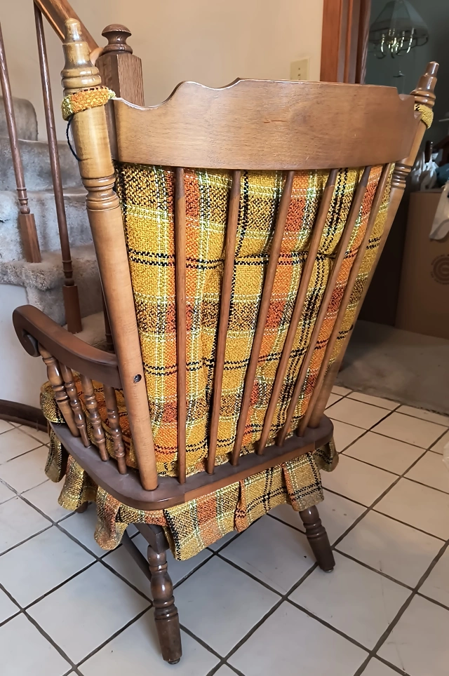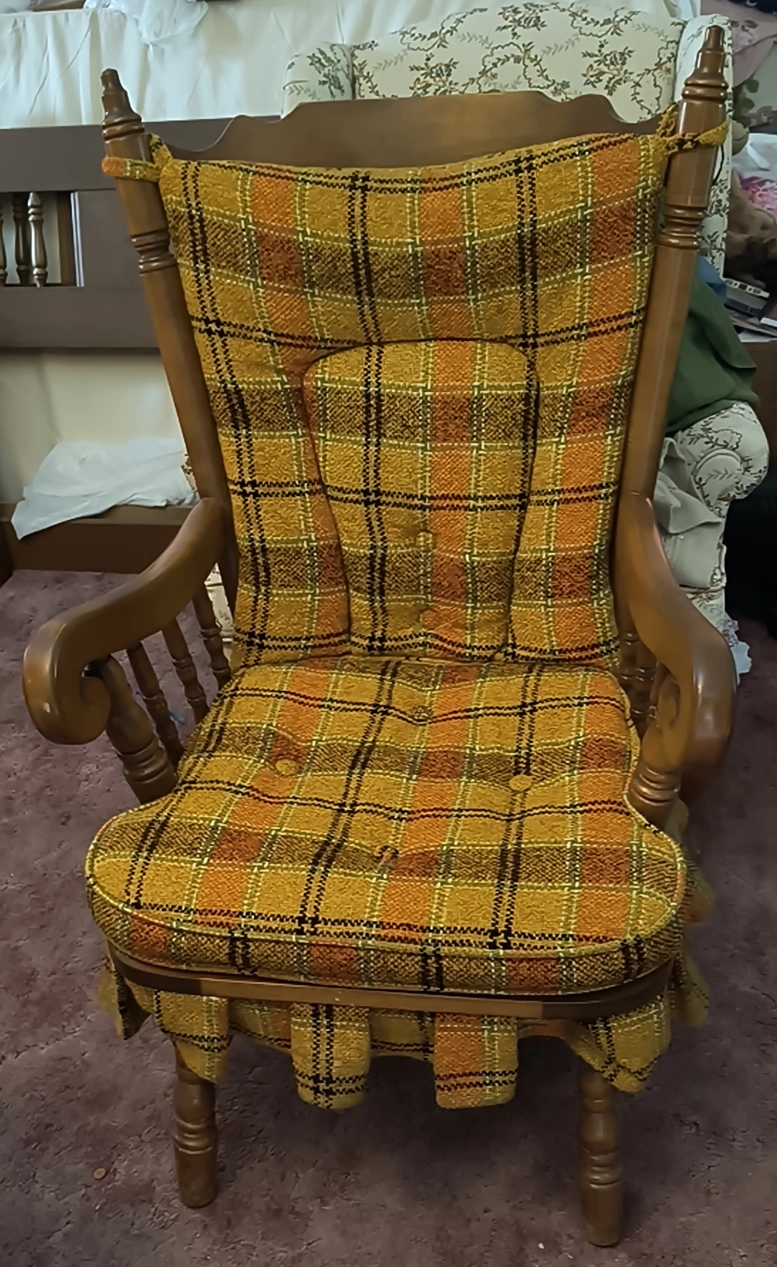 Selling a Colonial-style Maple Platform Rocking Chair with unique plaid cushions. It has a maple frame and armrests, adding to its classic charm. The chair has a comfortable cushioned seat and back, perfect for relaxing. It's a great piece to add character to any room!