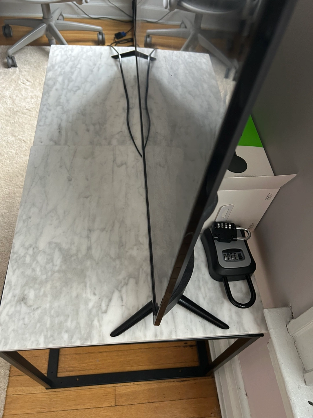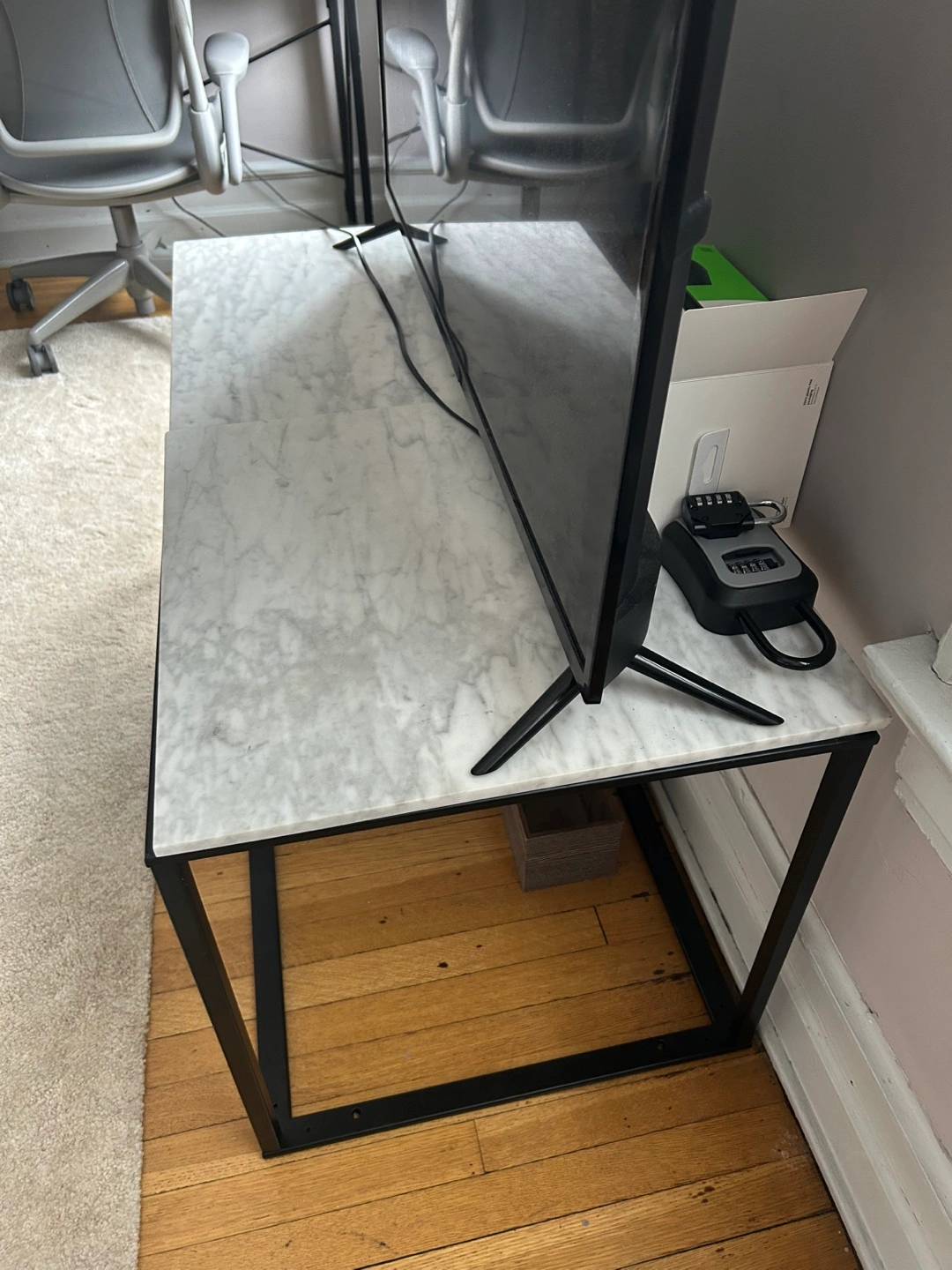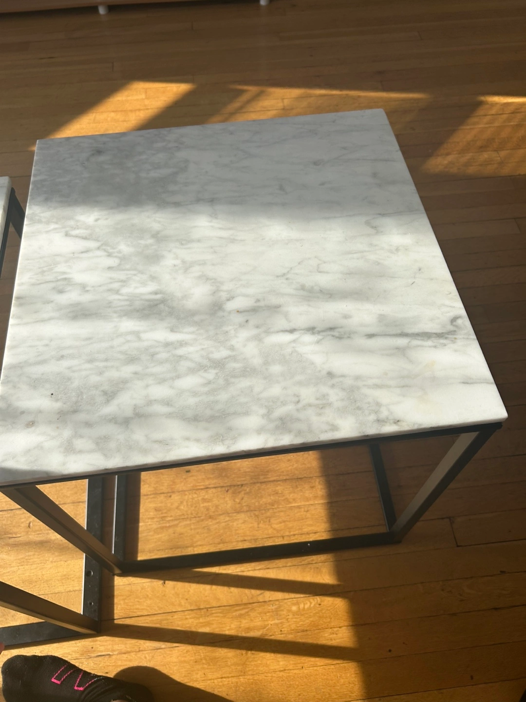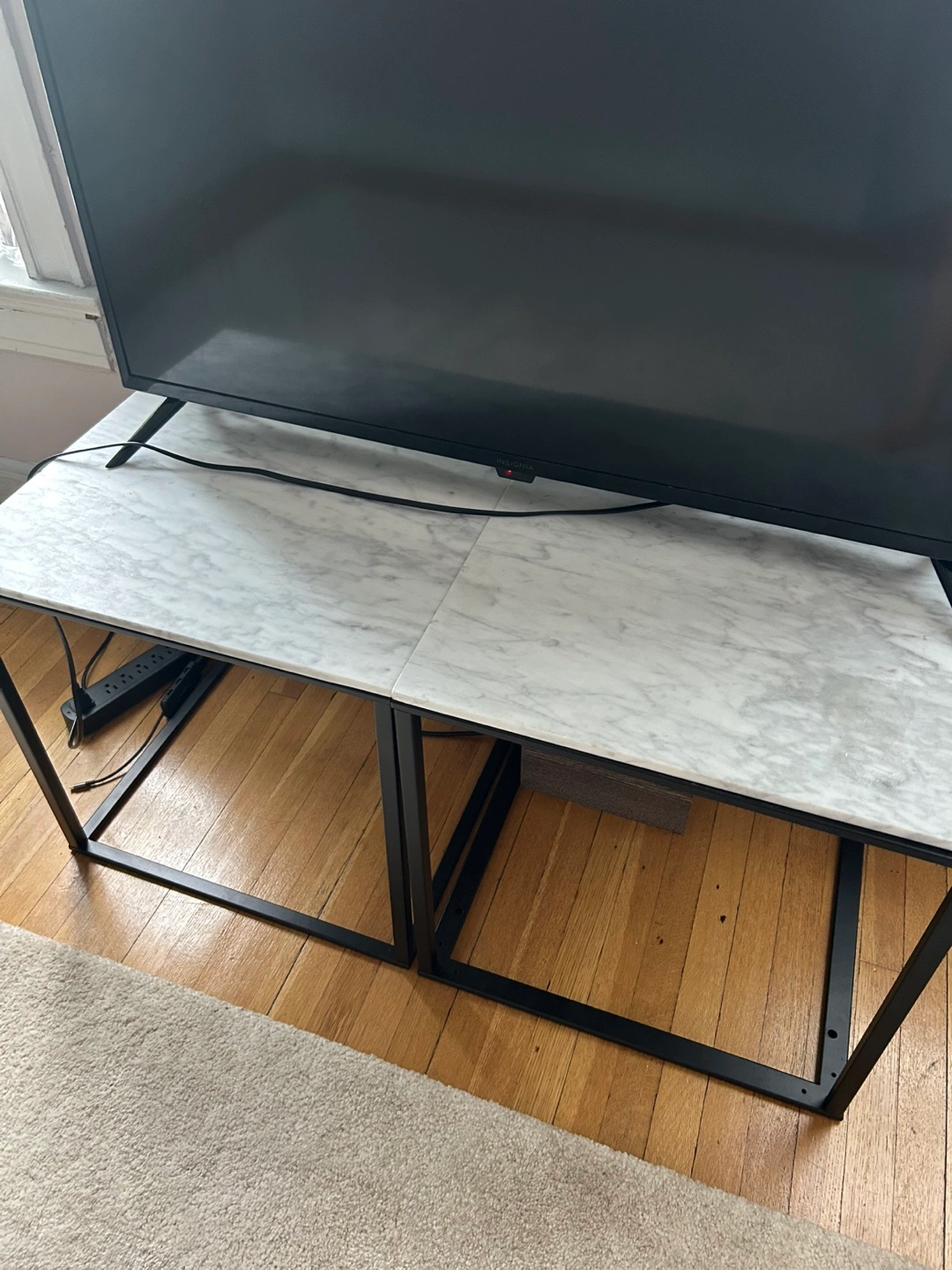 94Selling two marble side tables used as a modern TV stand with a sturdy black metal frame. The marble slates can be removed. It's in great condition and perfect for any living room setup! 2 side tables for $75 or $40 each 20x20x20