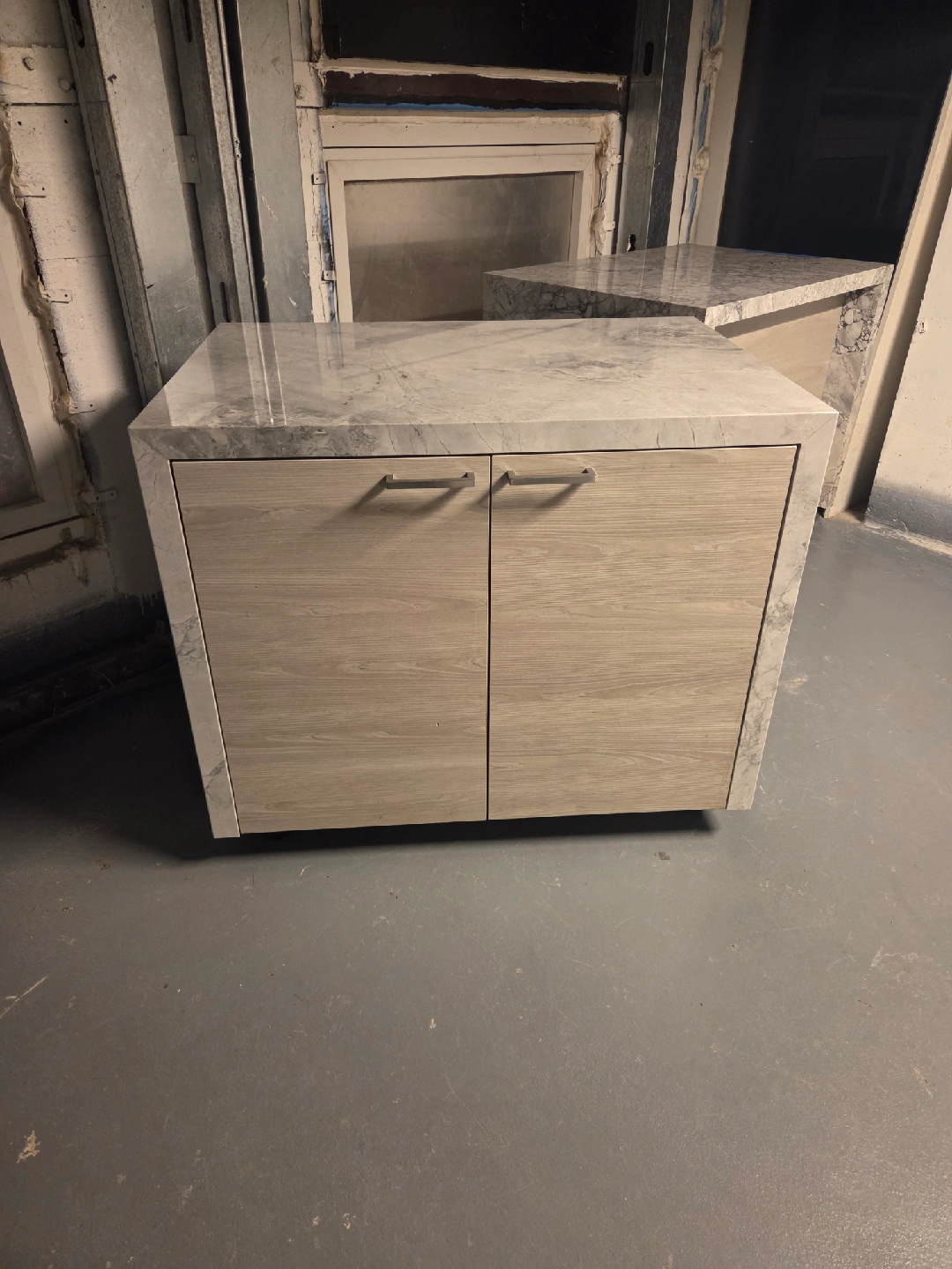 10Custom floating island cabinet with storage. Cabinetry done by Murretti group, featuring a book-matched waterfall marble countertop. Perfect for open kitchen floorplans. Can be utilized for everyday kitchen use, or easily wheeled off to the side as a bar top while entertaining guests. 2 available.