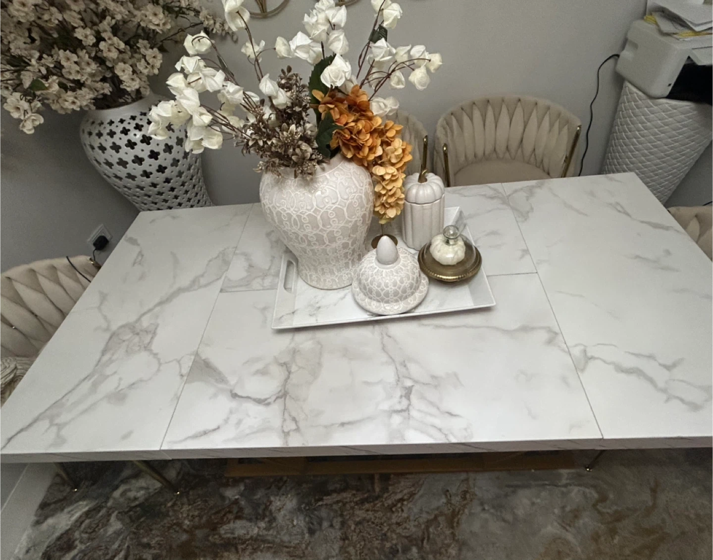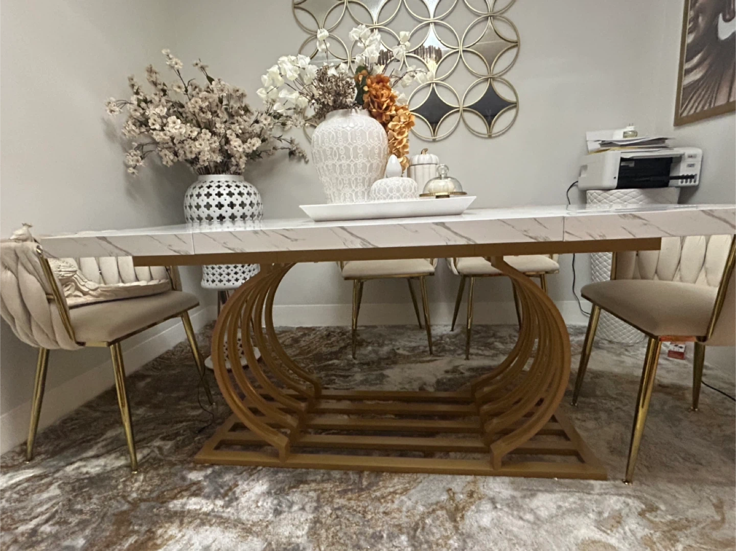 Furniture Set: Glass Dining Table, Chairs & Blue Sofa