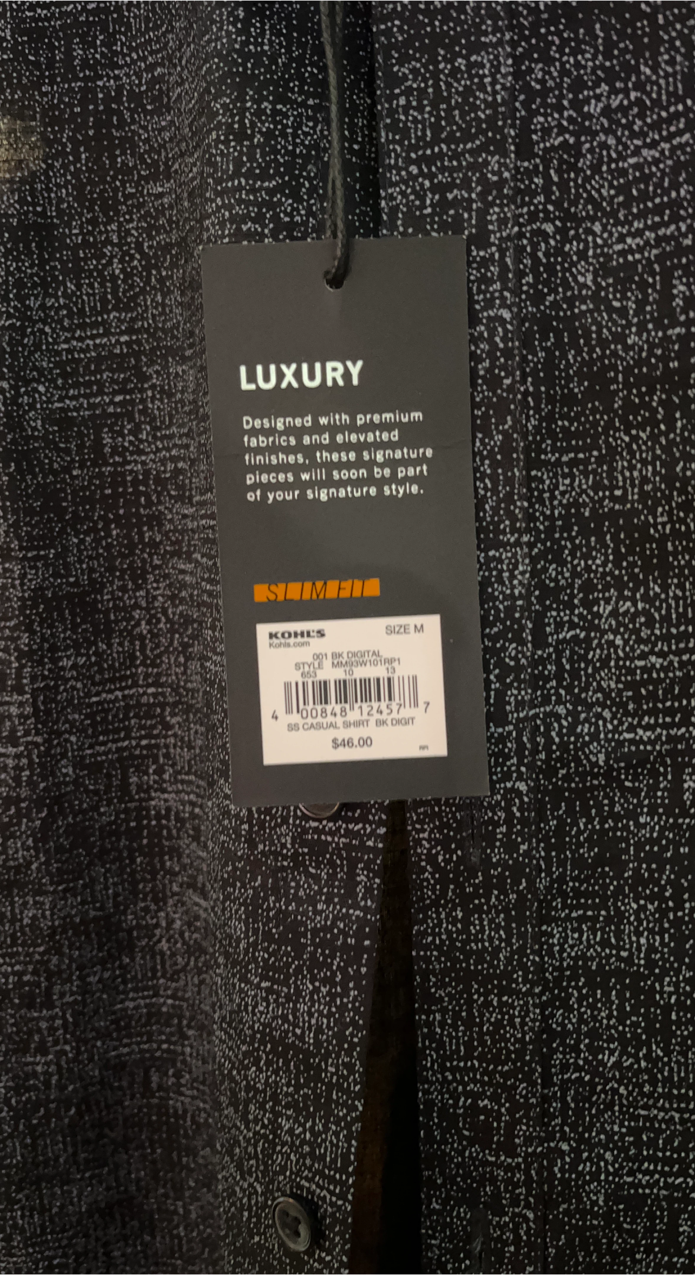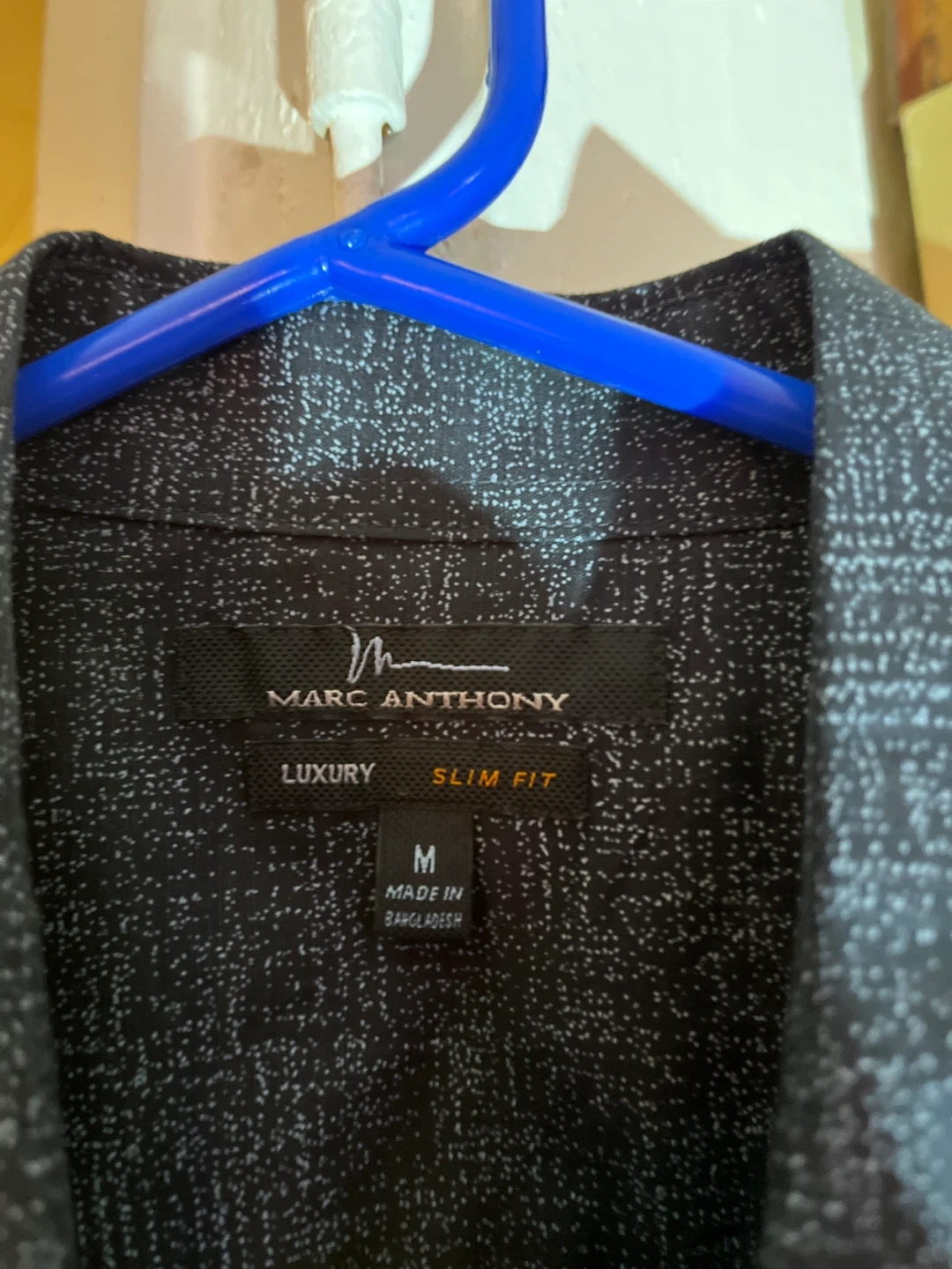 65Selling a Marc Anthony Luxury slim fit shirt in size medium. It's a stylish casual shirt with a black digital pattern. The original tag is still attached and it was originally bought for $46