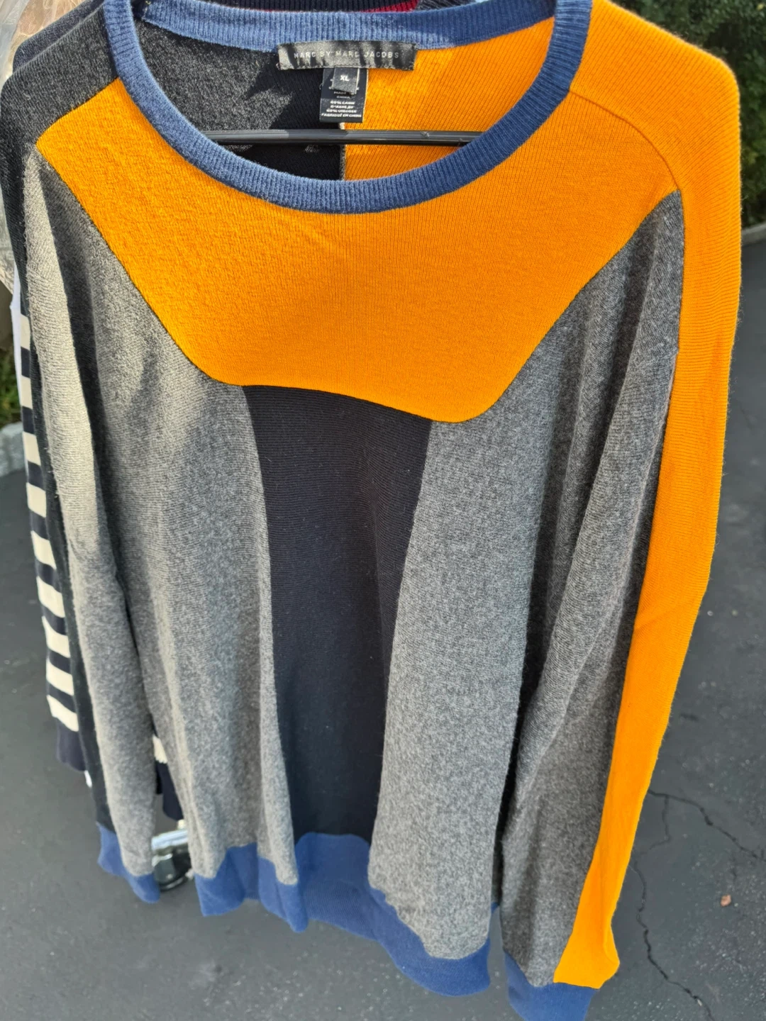 Selling a Marc by Marc Jacobs sweater in size XL! The sweater is a mix of colors including gray, black, orange, and blue. It's made of 50% lambswool and 50% viscose