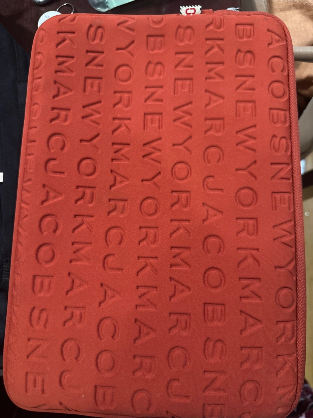 Red neoprene laptop sleeve. Features repeating Marc Jacobs branding.