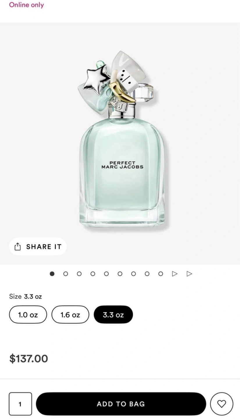 73Selling a Marc Jacobs Perfect Eau de Toilette. It's a 3.3 oz bottle. The original price was $137.00. It comes with the box Authentic perfume, new and only tested once. Comes in a tester box (no retail packaging), but the bottle is full and unused aside from the single spray. Purchased on sale, but I have too many perfumes — letting this one go to someone who’ll actually use it! For reference in Ulta Beauty it cost $137 (see the picture)