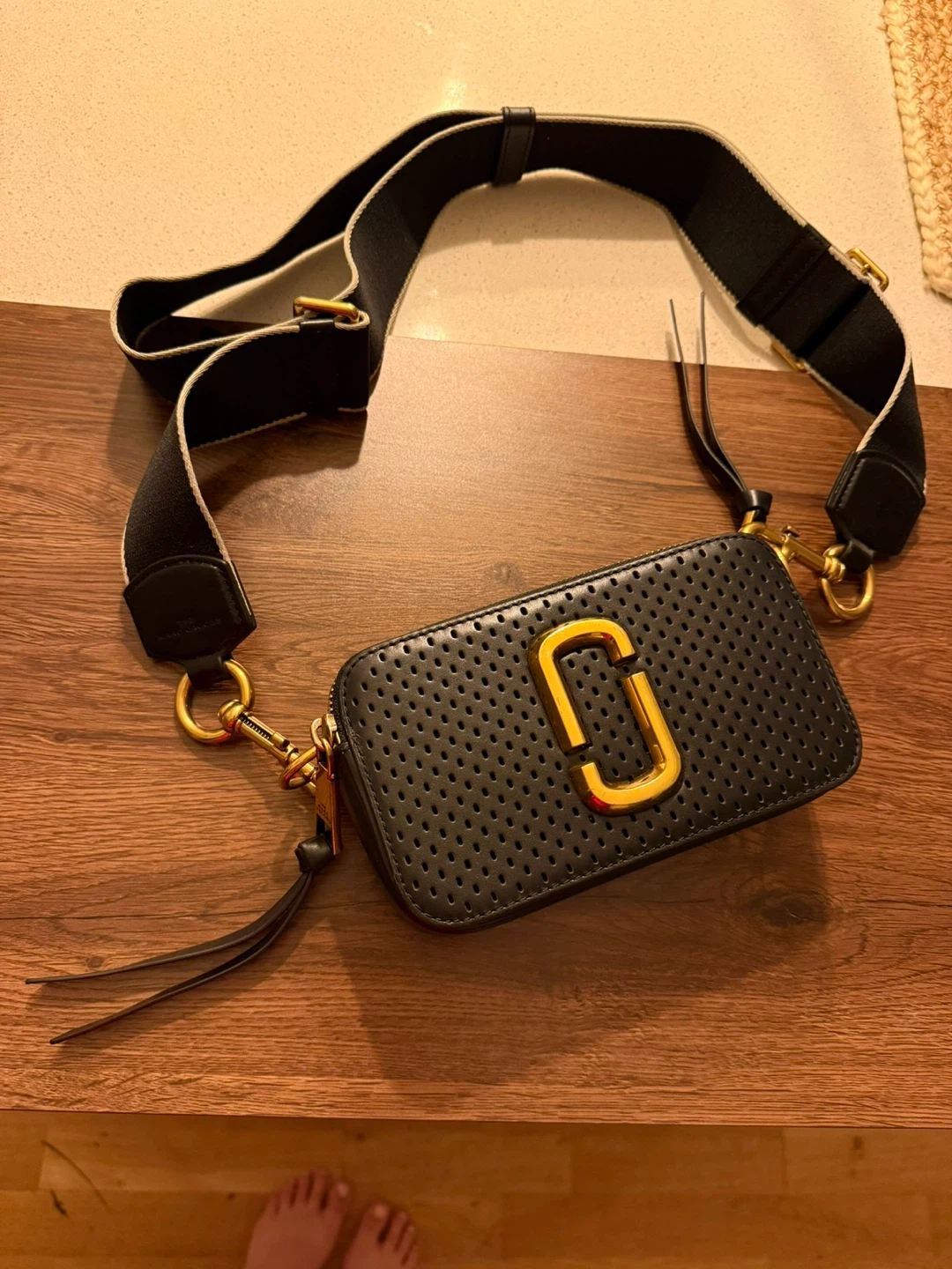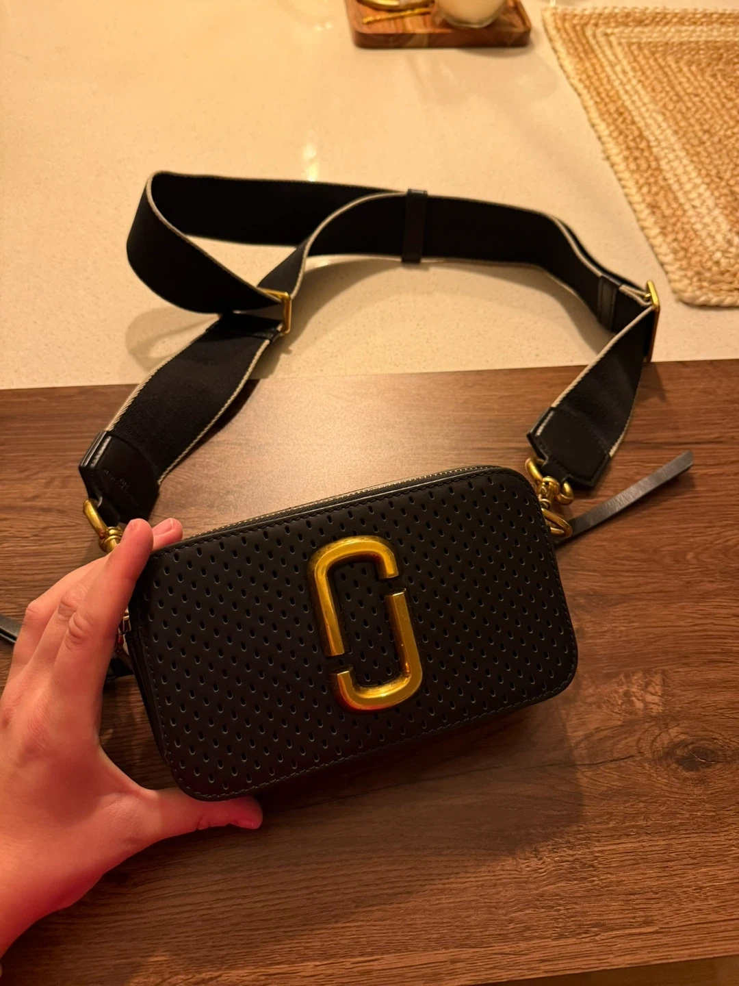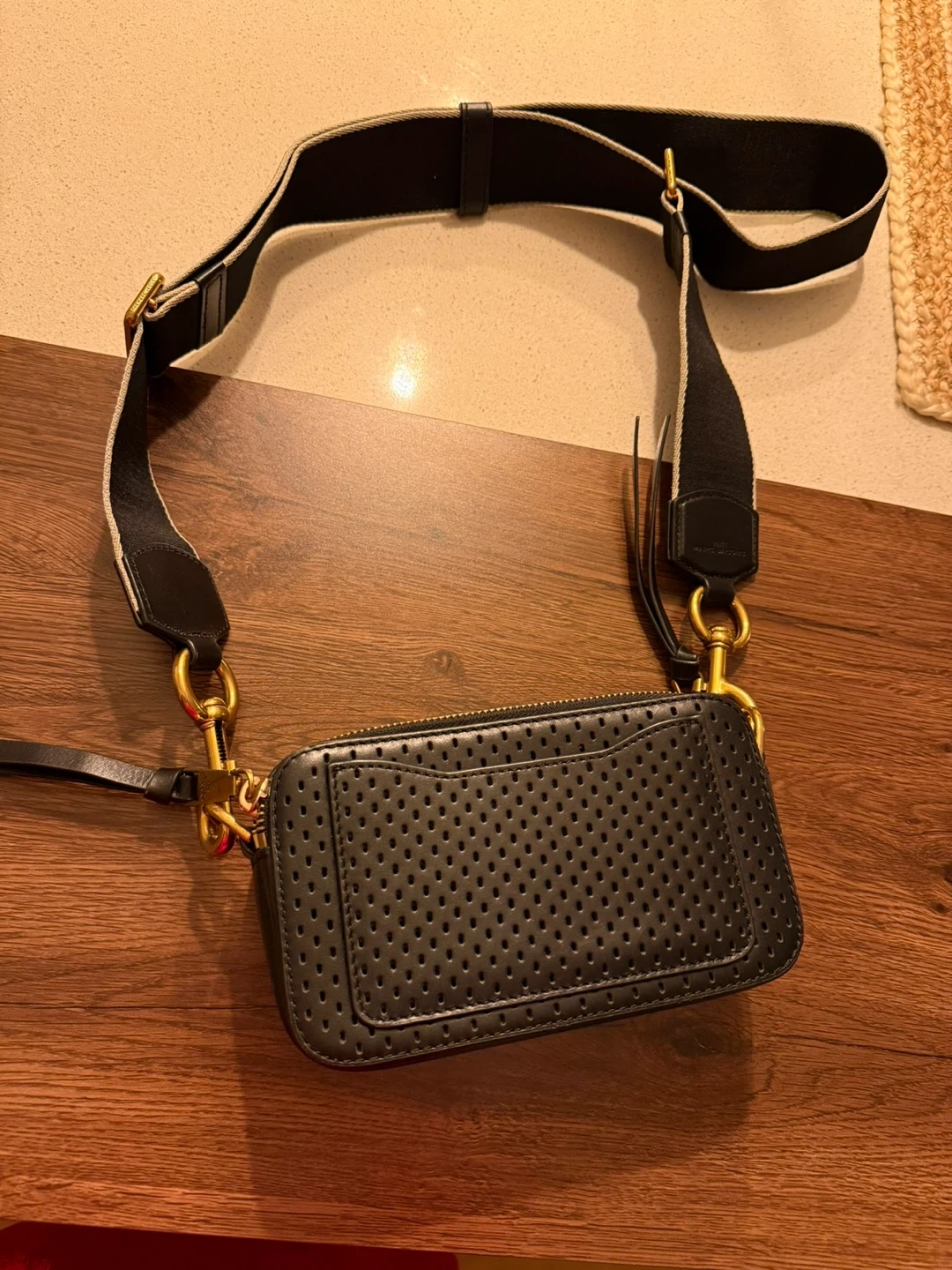Selling a gently used Marc Jacobs The Leather Box Bag 20 in black. This stylish bag features a perforated design and gold-tone hardware. It's perfect for adding a touch of edgy sophistication to any outfit!