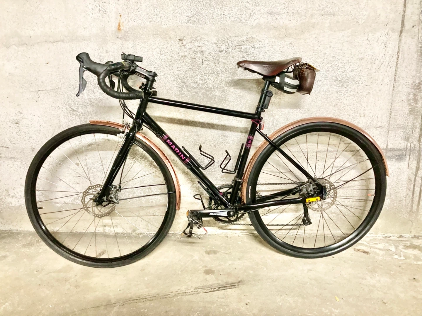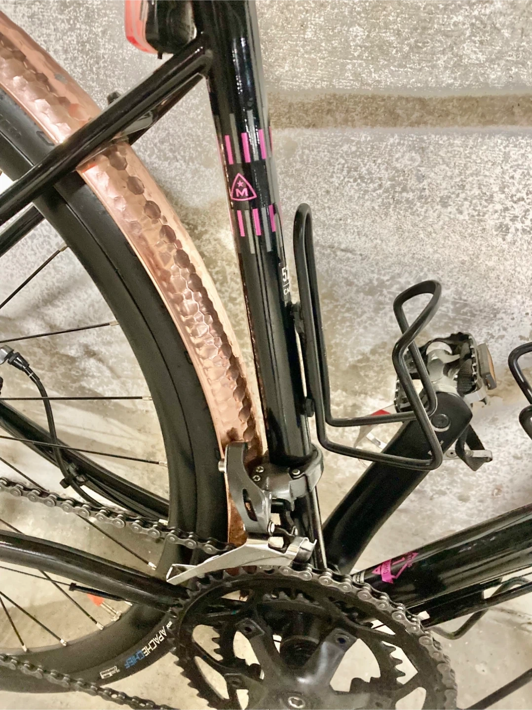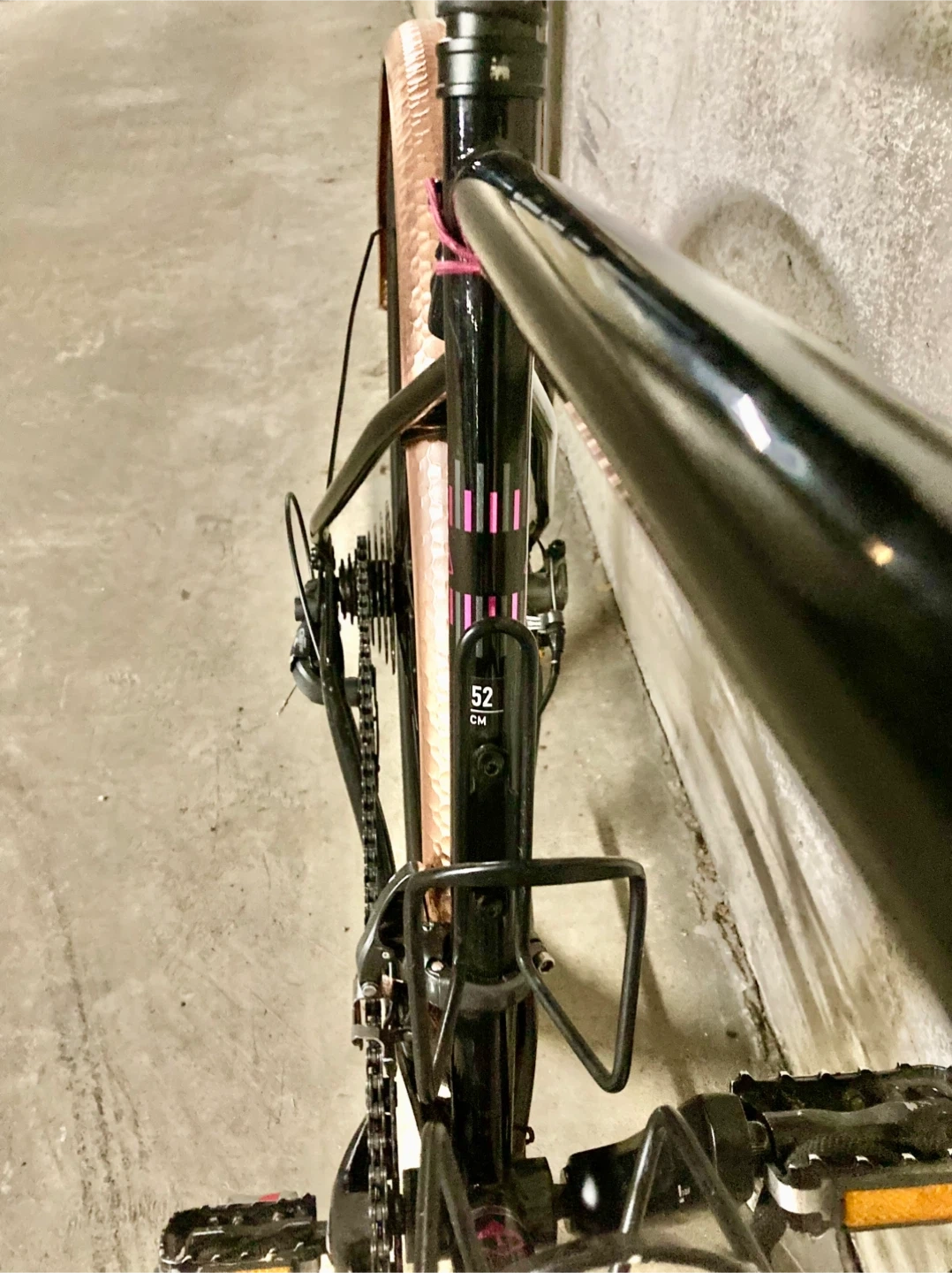 Selling a Marin Nicasio road bike 52cm in a sleek gloss black with pink accents and copper fenders. The Nicasio is designed to take you beyond the road, whether it's on asphalt or off-road terrains. It features classic lines and CrMo frame tubes, offering a blend of modern and traditional design. Very clean with precise shifting and strong brakes. Key features include: - Double Butted CrMo steel frame and fork - Shimano Claris 2x8 drivetrain - Marin aluminum double wall rims on forged aluminum hubs - Promax Render R Road mechanical disc brakes