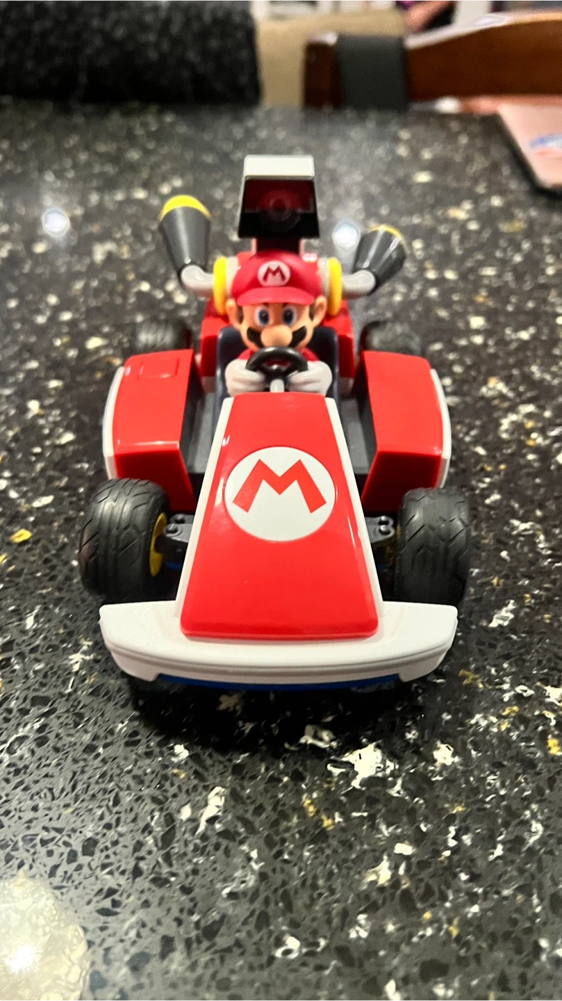 10Selling a fun Mario Kart racer toy! This toy is in great condition and ready for a new home. It features a red and white design with the iconic 'M' logo. Perfect for any Mario fan!