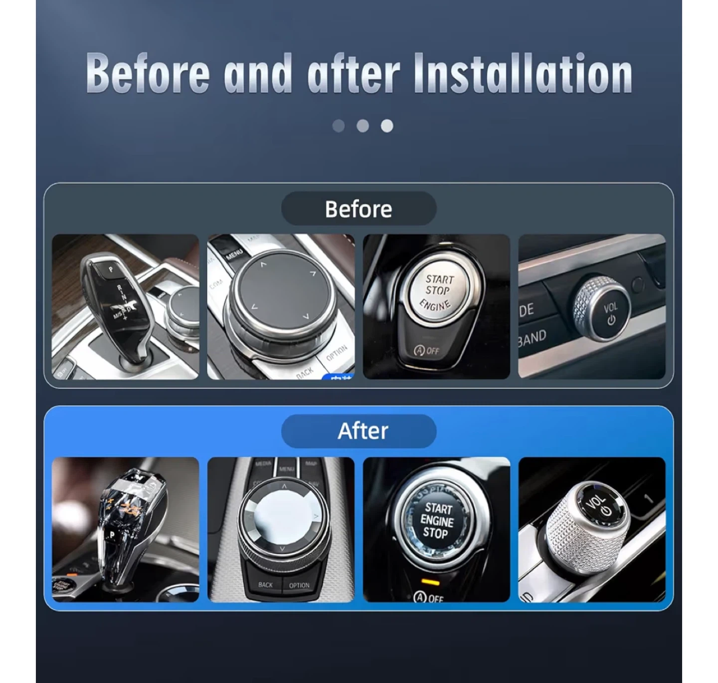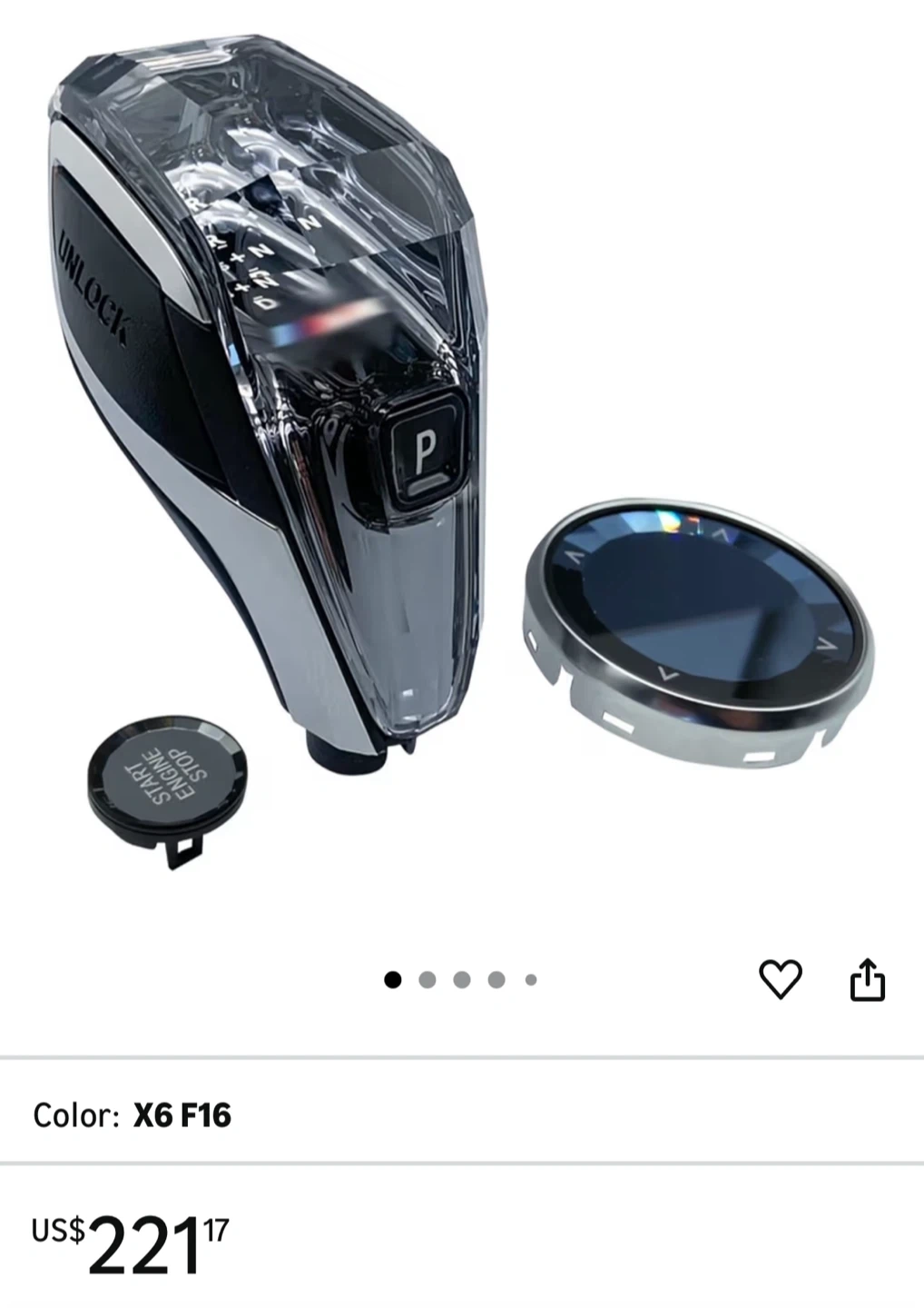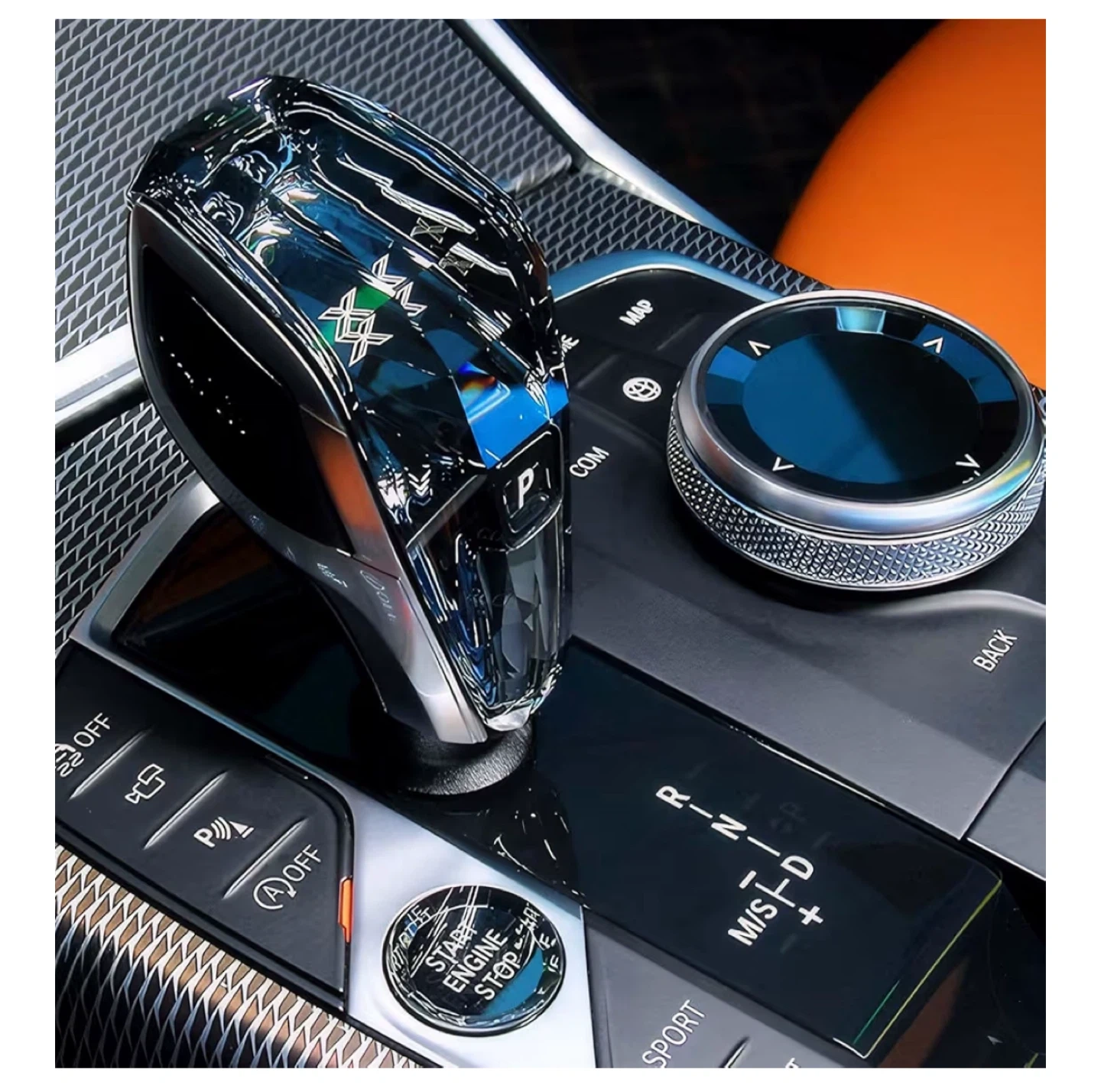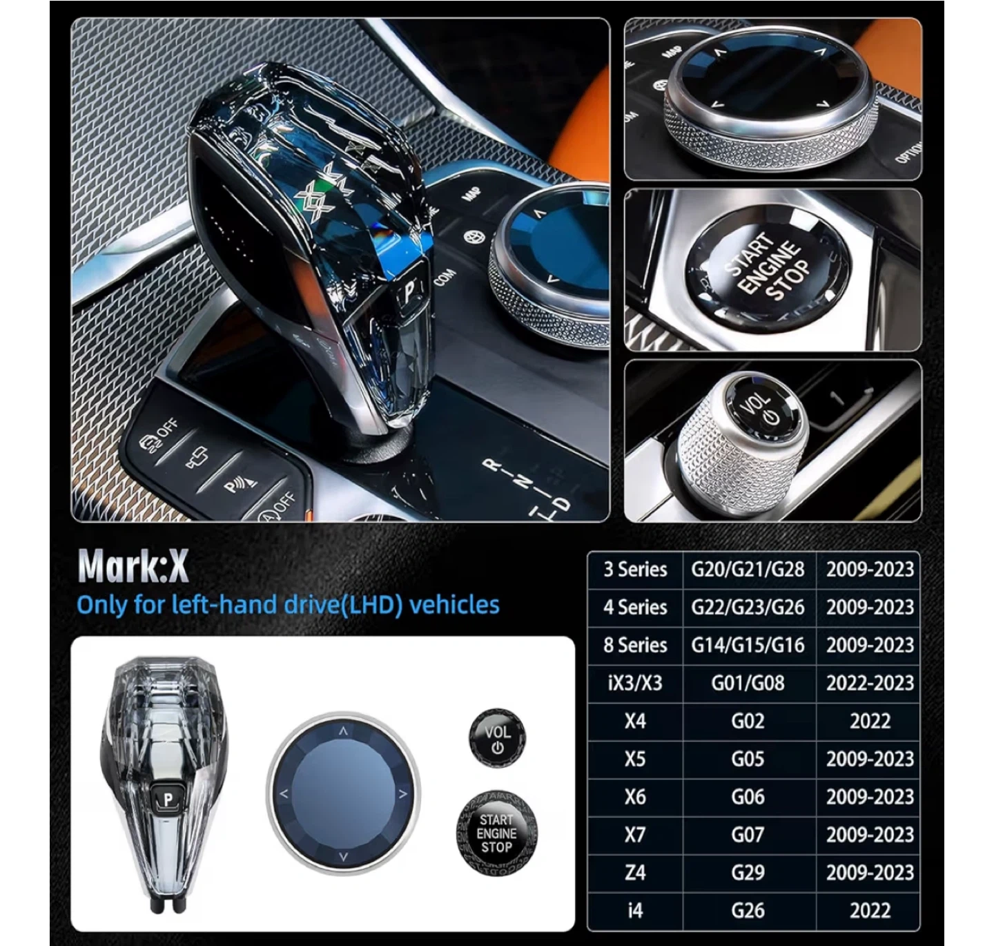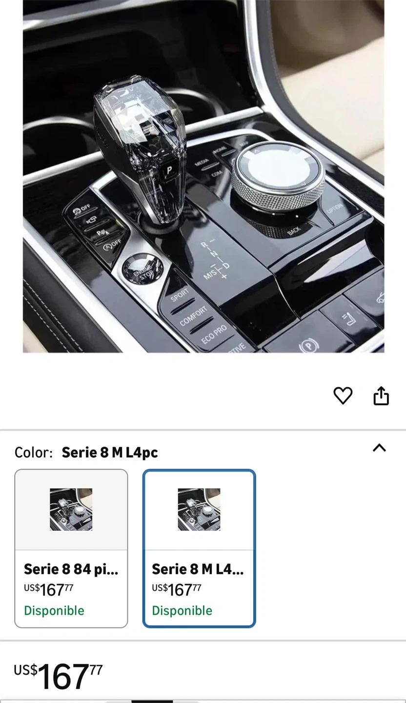 Selling a Mark:X gear shift knob designed for BMW models. Based on the screenshots, it appears to be compatible with Serie 8 M L4pc. It also includes a start/stop engine button cover and media control knob cover. Please note that it is designed for left-hand drive (LHD) vehicles.