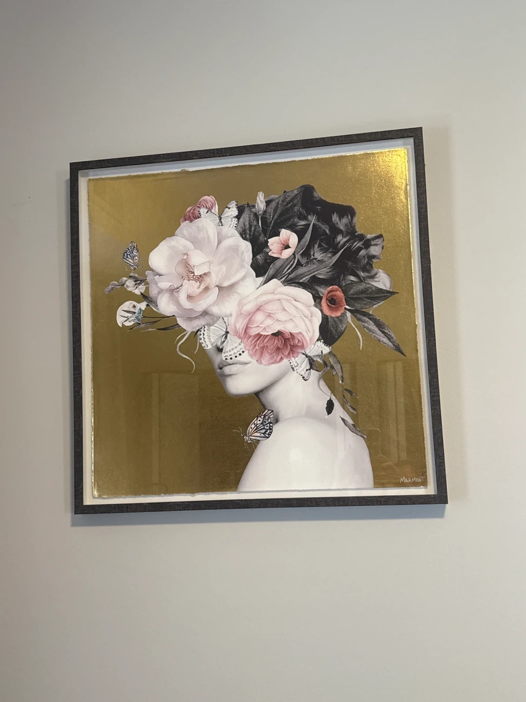 60Selling a beautiful Marmont Hill framed wall art piece. It features a woman with flowers and butterflies, set against a gold background. The frame is a dark gray color. It's in great condition and would look lovely in any room