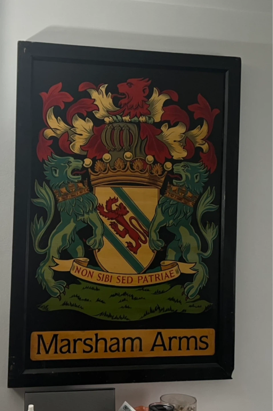 Selling a framed crest of Marsham Arms. It features a detailed coat of arms with lions and a red griffin on a shield. The frame is black. Perfect for adding a touch of history to your home!