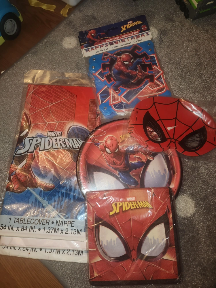 10Get ready to celebrate with this Marvel Spiderman party supply set! It includes 7 pieces A tablecloth (54 in x 84 in / 1.37m x 2.13m) 2.- A Happy Birthday banner (6.4 ft / 1.95m long) - Plates and napkins featuring Spiderman - Spiderman masks Perfect for a Spiderman-themed birthday party!