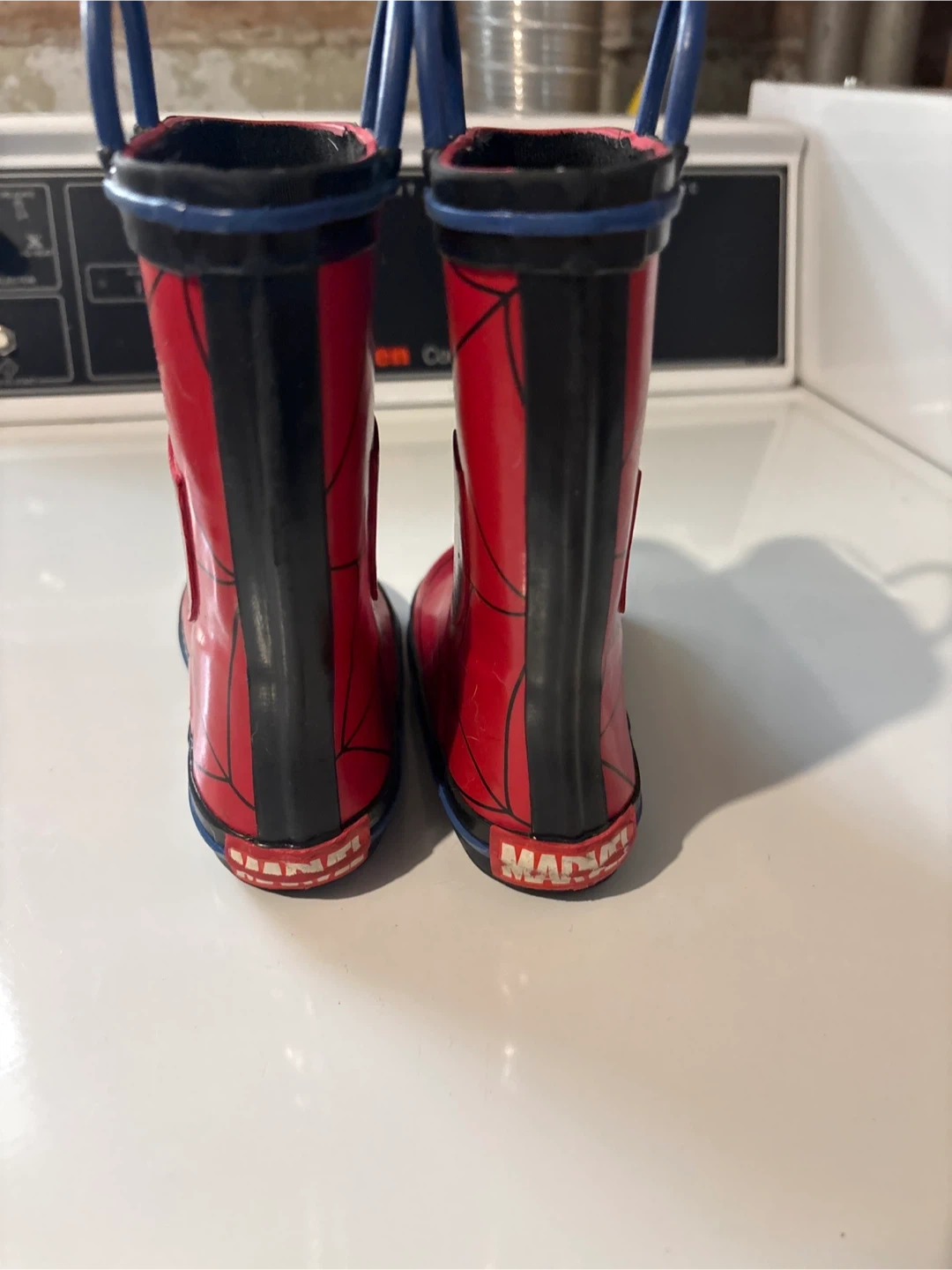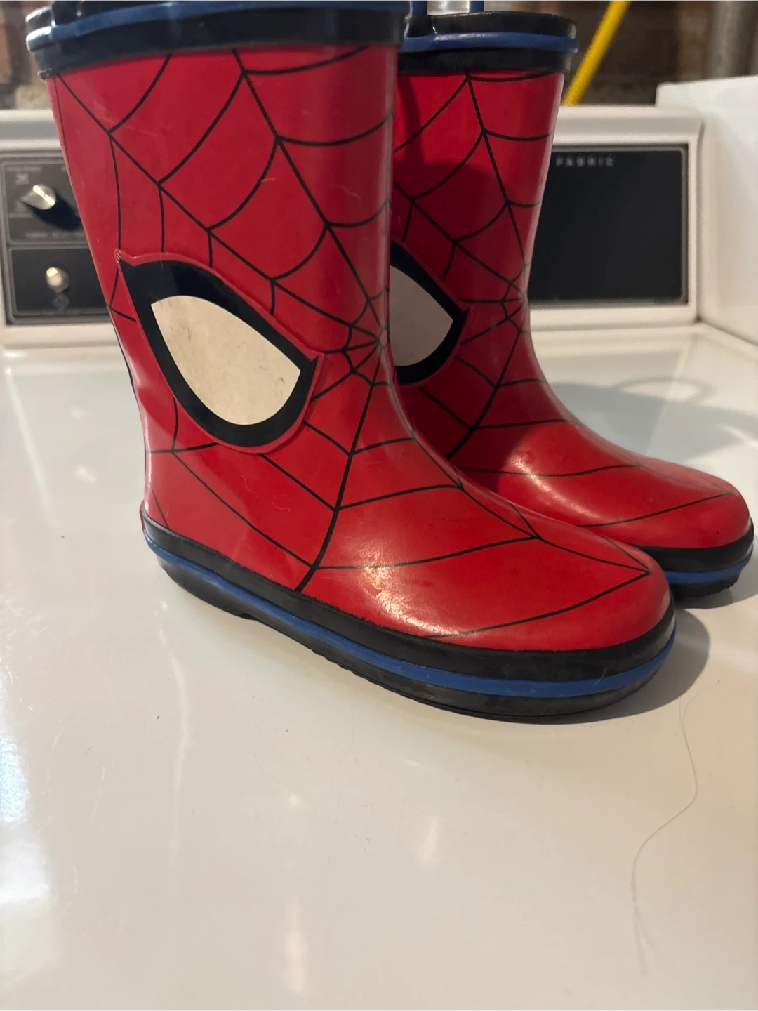 Soze 9-10 Cool Spiderman rain boots for your little superhero! These boots are red with a Spiderman web design and the Marvel logo on the back. Perfect for rainy days!
